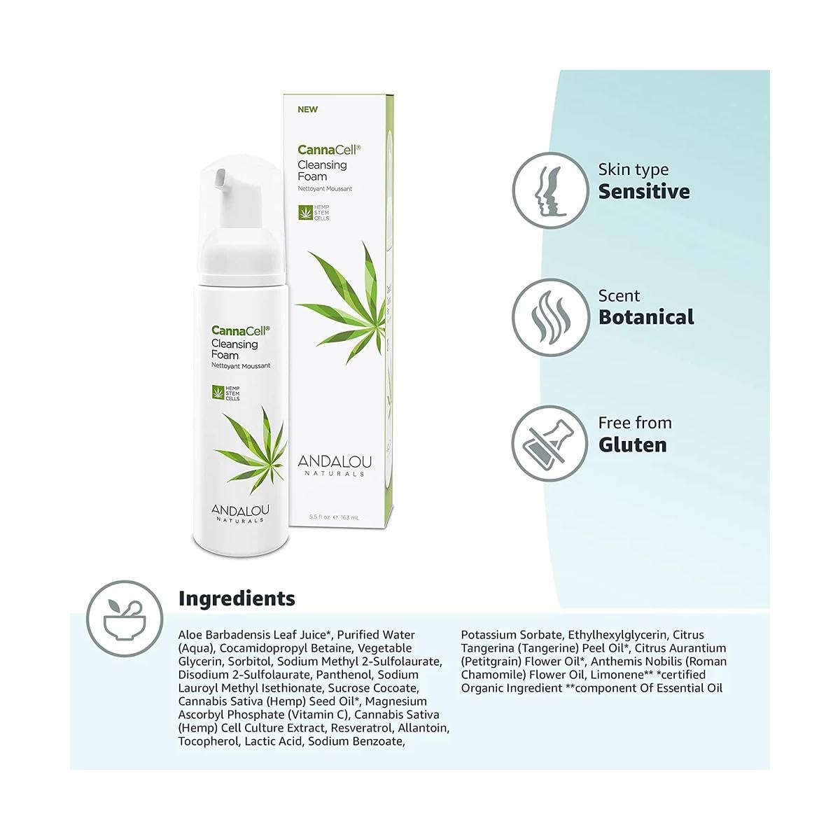 About this item BOTANICAL CLEANSER: Our nourishing, botanical cleansing foam with CannaCell hemp stem cells, organic hemp seed oil, & pure plant essential oils calms & cleanses even sensitive skin without overdrying. VEGAN FACE WASH: Formulated with bioavailable vegan ingredients to be gentle & effective for all skin types, our CannaCell Cleansing Foam is the perfect face wash to add to your skin care routine. INGREDIENTS FROM NATURE: We support Superior Source Ingredient Standards & only use ingredients that are organic, non-GMO, gluten free, sustainable, fair trade, cruelty free, & nature-derived. STEM CELL SKIN CARE: Our CannaCell line uses proprietary CannaCell—powerful, natural antioxidants cultivated from hemp stem cells that help defend against premature aging, pollution, & UV exposure. ANDALOU NATURALS: We are the first Non-GMO Project Verified beauty brand & our commitment to uplifting people & the planet is reflected in our hair products, cleansers, lotions, serums, face masks & more! See more product details,BOTANICAL CLEANSER: Our nourishing, botanical cleansing foam with CannaCell hemp stem cells, organic hemp seed oil, & pure plant essential oils calms & cleanses even sensitive skin without overdrying,VEGAN FACE WASH: Formulated with bioavailable vegan ingredients to be gentle & effective for all skin types, our CannaCell Cleansing Foam is the perfect face wash to add to your skin care routine,INGREDIENTS FROM NATURE: We support Superior Source Ingredient Standards & only use ingredients that are organic, non-GMO, gluten free, sustainable, fair trade, cruelty free, & nature-derived,STEM CELL SKIN CARE: Our CannaCell line uses proprietary CannaCell—powerful, natural antioxidants cultivated from hemp stem cells that help defend against premature aging, pollution, & UV exposure,ANDALOU NATURALS: We are the first Non-GMO Project Verified beauty brand & our commitment to uplifting people & the planet is reflected in our hair products, cleansers, lotions, serums, face masks & more!