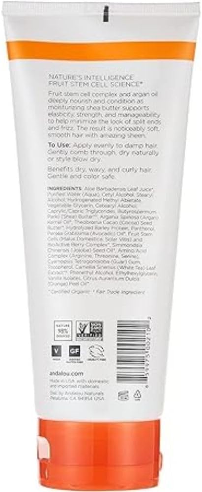 Argan Oil & Sweet Orange Moisture Rich Styling Cream 6.8 ozProduct DescriptionFruit stem cell complex and argan oil deeply nourishes and conditions as moisturizing shea butter supports elasticity, strength, and manageability to help minimize the look of split ends and frizz. The result is noticeably soft, smooth hair with amazing sheen.Andalou Naturals Moisture RichArgan Oil & SheaFor Soft, Smooth SheenBenefits dry, wavy, and curly hair. Directions Apply evenly to damp hair. Gently comb through, dry naturally or style blow dry. Benefits Dry, Wavy, and Curly Hair. Gentle and color safe. Other Ingredients: Aloe Barbadensis Leaf Juice*, Purified Water (Aqua), Cetyl Alcohol, Stearyl Alcohol, Vegetable Glycerin, Butyrospermum Parkii (Shea) Butter*, Hydrogenated Methyl Abietate, Cetearyl Alcohol, Ethylhexyl Palmitate, Argania Spinosa (Argan) Kernel Oil*, Theobroma Cacao (Cocoa) Seed Butter*, Cocos Nucifera (Coconut) Oil*, Amodimethicone, Panthenol, Hydrolyzed Rice Protein, Persea Gratissima (Avocado) Oil*, Fruit Stem Cells (Malus Domestica, Solar Vitis) and BioActive 8 Berry Complex*, Simmondsia Chinensis (Jojoba) Seed Oil*, Amino Acid Complex (Arginine, Threonine, Serine), Hydrolyzed Soy Protein, Dimethicone, Tocopherol, Aspalathus Linearis (Rooibos) Extract*, Camellia Sinensis (White Tea) Leaf Extract*, Phenethyl Alcohol, Ethylhexylglycerin, Vanilla Isolates, Citrus Aurantium Dulcis (Orange) Peel Oil* *Certified Organic Ingredients Fair Trade Ingredients Warnings: Keep out of reach of children. As with all dietary supplements, consult your healthcare professional before use. See product label for more information,MOISTURE RICH for Dry, Wavy and Curly Hair,ARGAN OIL + SHEA BUTTER support elasticity, strength and manageability,STYLING CREAM for flexible hold and heat protection,FRUIT STEM CELL SCIENCE captures nature’s intelligence in every product,Andalou Naturals: Non-GMO remains a core brand value of Andalou Naturals and we continue to source superior non-GMO ingredients for our products