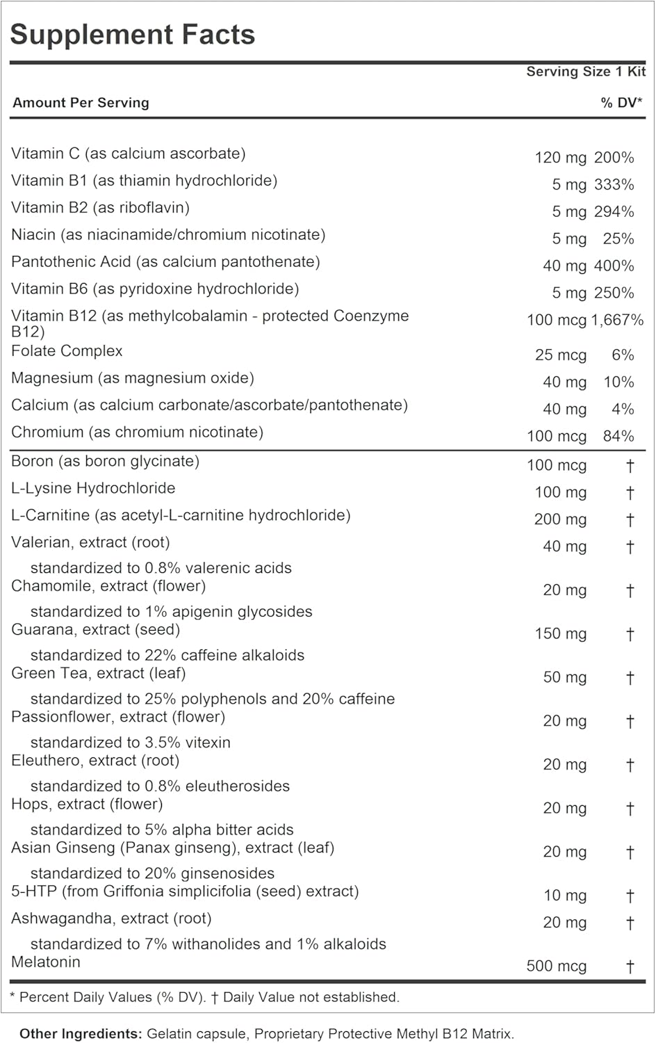 Superior pure bio-active ingredients - a.m. activator delivers standardized extracts from guarana, green tea, eleuthero, asian ginseng, ashwagandha and b-complex vitamins. p.m. relaxation delivers valerian, chamomile, passionflower, hops, 5-htp, melatonin, pantothenic acid and calcium. both: L-Carnitine, Boron, L-Lysine Hydrochloride, Vitamin C, Magnesium and Chromium. Contains no Milk / Dairy-Free, Gluten-Free; no Additives or Common Allergens of Any Kind