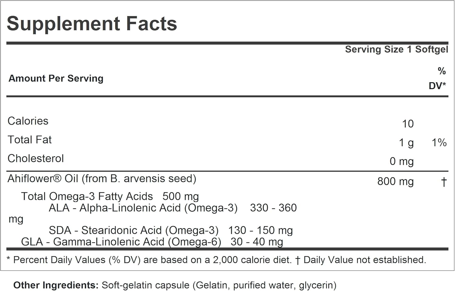 Uniquely balanced, plant-based, non-gmo source of essential omega-3 fatty acids from ahiflower oil - The world's richest natural source of SDA, which is far more effectively converted to EPA than the ALA present in most plants. Delivers greater Omega-3 bioactivity than all other non-marine, plant-based oils. Provides GLA, an important precursor for the production of our body's vital prostaglandins, which play a multitude of roles promoting health and wellness