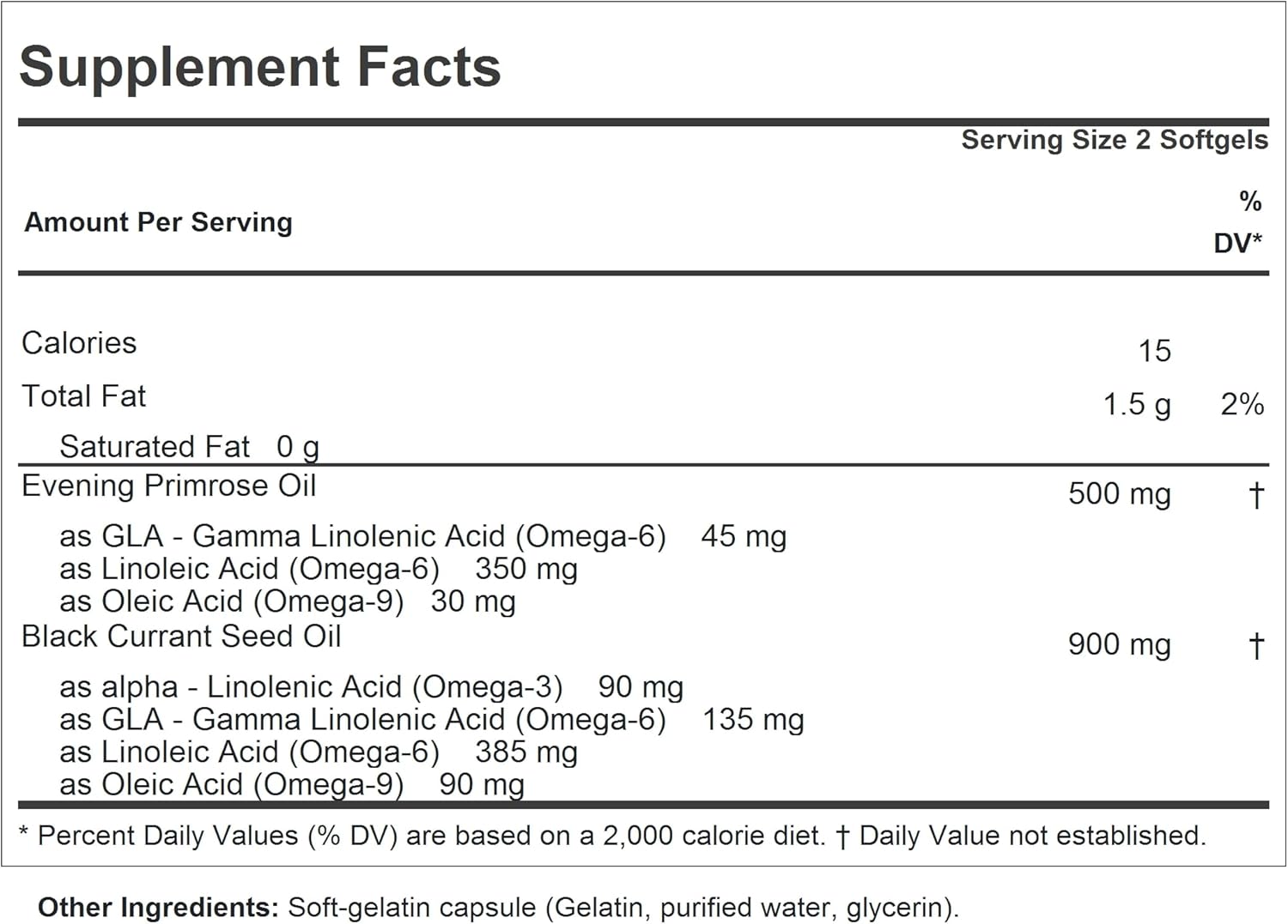 Superior pure bio-active ingredients - Delivers concentrated essential fatty acids from Evening Primrose and Black Current Seed oils. Contains no Milk /Dairy-Free, Gluten-Free; no soy, yeast, corn, wheat, sodium, salt, sugar, cholesterol, color, preservative, common allergens or manufacturing additives