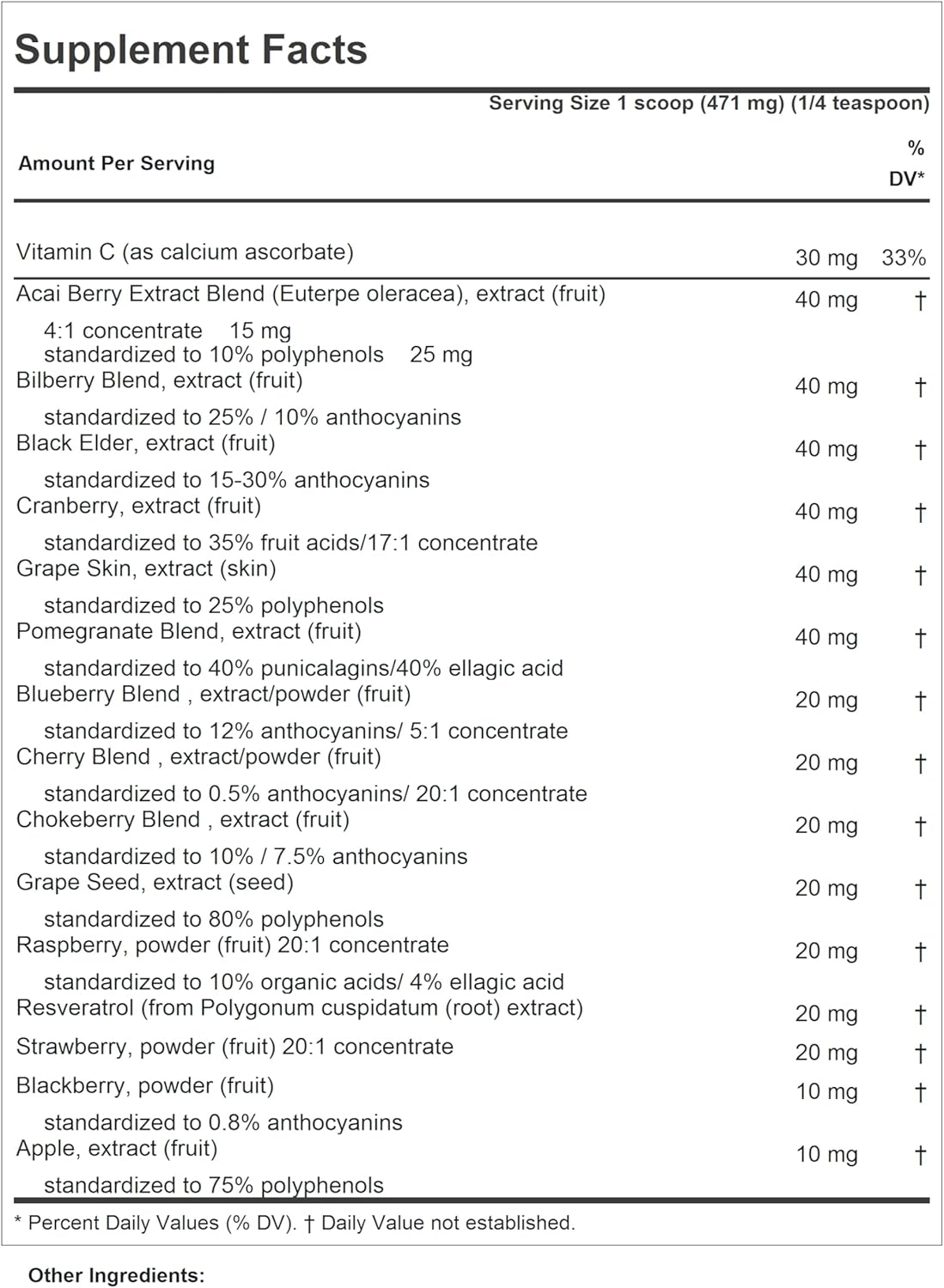 Superior pure bio-active ingredients - Combines 14 standardized extracts of the most well-researched fruits and berries: Bilberry, Cranberry, Grape seed, Grape skin, Apple, Pomegranate, Acai, Blackberry, Elderberry, Raspberry, Strawberry, Chokeberry, Blueberry, Resveratrol and Vitamin C. Contains no Milk / Dairy-Free, Gluten Free; no soy, yeast, wheat, sodium, salt, sugar, fat, cholesterol, color, preservative, common allergens or manufacturing additives