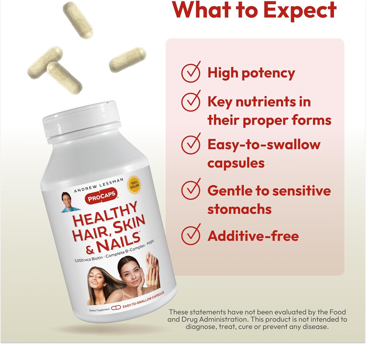 About this item For the healthiest appearance and growth of your hair, skin & nails - These tissues never stop growing and require specialized nutrients, which are impossible to satisfy even with the healthiest diet. Delivers the nutritional requirements to satisfy the needs of healthy hair, skin and nail growth. Andrew Lessman's Healthy Hair, Skin and Nails effectively ensures that you possess all you require on the inside of your body to create the most beautiful hair, skin and nails on the outside. Superior pure bio-active ingredients - A targeted blend of Biotin, (MSM) Methylsulfonylmethane, Vitamins C, D and B complex, Silicon. Our biotin supplements contain no Milk / Dairy-Free, Gluten Free; no soy, yeast, wheat, sodium, salt, sugar, starch, fat, cholesterol, oil, emulsifier, wax, binder, filler, excipient, lubricant, coating, diluent, flowing agent, common allergens, color, flavor, sweetener or preservative. Unsurpassed purity, quality & efficacy - For 40+ years, ProCaps has produced high-quality, bioactive supplements in micro-granulated powders for fast absorption and maximum effectiveness. ProCaps products contain no added binders, fillers, lubricants, stabilizers, flowing agents, preservatives or artificial colors. Our small, easy-to-swallow capsules and non-acidic formulas are gentle on the stomach. Manufacturer direct and made in Henderson, Nevada - Ethical and eco-friendly, ProCaps formulates, manufactures, and controls every aspect of its products: from formulation, ingredient sourcing, production and quality control. ProCaps' facilities are 100% Solar Powered with a Zero Carbon Footprint. All ProCaps bottles are made from 100% recyclable post-consumer resin. Plus, Andrew Lessman and ProCaps are the largest donor of prenatal vitamins in the world (over 2 billion capsules donated to date). Ethical & Eco-friendly. Zero Carbon Footprint - Uniquely committed to your health and the health of the planet, ProCaps' facilities are 100% Solar Powered with a Zero Carbon Footprint and an LEED Gold green building status. All ProCaps bottles are made from 100% recyclable post-consumer resin. Plus, Andrew Lessman and ProCaps are the largest donor of prenatal vitamins in the world (over 2 billion capsules donated to date). ProCaps, the Informed Choice for Nutritional Supplements. See more product details,For the healthiest appearance and growth of your hair, skin & nails - These tissues never stop growing and require specialized nutrients, which are impossible to satisfy even with the healthiest diet. Delivers the nutritional requirements to satisfy the needs of healthy hair, skin and nail growth. Andrew Lessman's Healthy Hair, Skin and Nails effectively ensures that you possess all you require on the inside of your body to create the most beautiful hair, skin and nails on the outside,Superior pure bio-active ingredients - A targeted blend of Biotin, (MSM) Methylsulfonylmethane, Vitamins C, D and B complex, Silicon. Our biotin supplements contain no Milk / Dairy-Free, Gluten Free; no soy, yeast, wheat, sodium, salt, sugar, starch, fat, cholesterol, oil, emulsifier, wax, binder, filler, excipient, lubricant, coating, diluent, flowing agent, common allergens, color, flavor, sweetener or preservative,Unsurpassed purity, quality & efficacy - For 40+ years, ProCaps has produced high-quality, bioactive supplements in micro-granulated powders for fast absorption and maximum effectiveness. ProCaps products contain no added binders, fillers, lubricants, stabilizers, flowing agents, preservatives or artificial colors. Our small, easy-to-swallow capsules and non-acidic formulas are gentle on the stomach,Manufacturer direct and made in Henderson, Nevada - Ethical and eco-friendly, ProCaps formulates, manufactures, and controls every aspect of its products: from formulation, ingredient sourcing, production and quality control. ProCaps' facilities are 100% Solar Powered with a Zero Carbon Footprint. All ProCaps bottles are made from 100% recyclable post-consumer resin. Plus, Andrew Lessman and ProCaps are the largest donor of prenatal vitamins in the world (over 2 billion capsules donated to date),Ethical & Eco-friendly. Zero Carbon Footprint - Uniquely committed to your health and the health of the planet, ProCaps' facilities are 100% Solar Powered with a Zero Carbon Footprint and an LEED Gold green building status. All ProCaps bottles are made from 100% recyclable post-consumer resin. Plus, Andrew Lessman and ProCaps are the largest donor of prenatal vitamins in the world (over 2 billion capsules donated to date). ProCaps, the Informed Choice for Nutritional Supplements