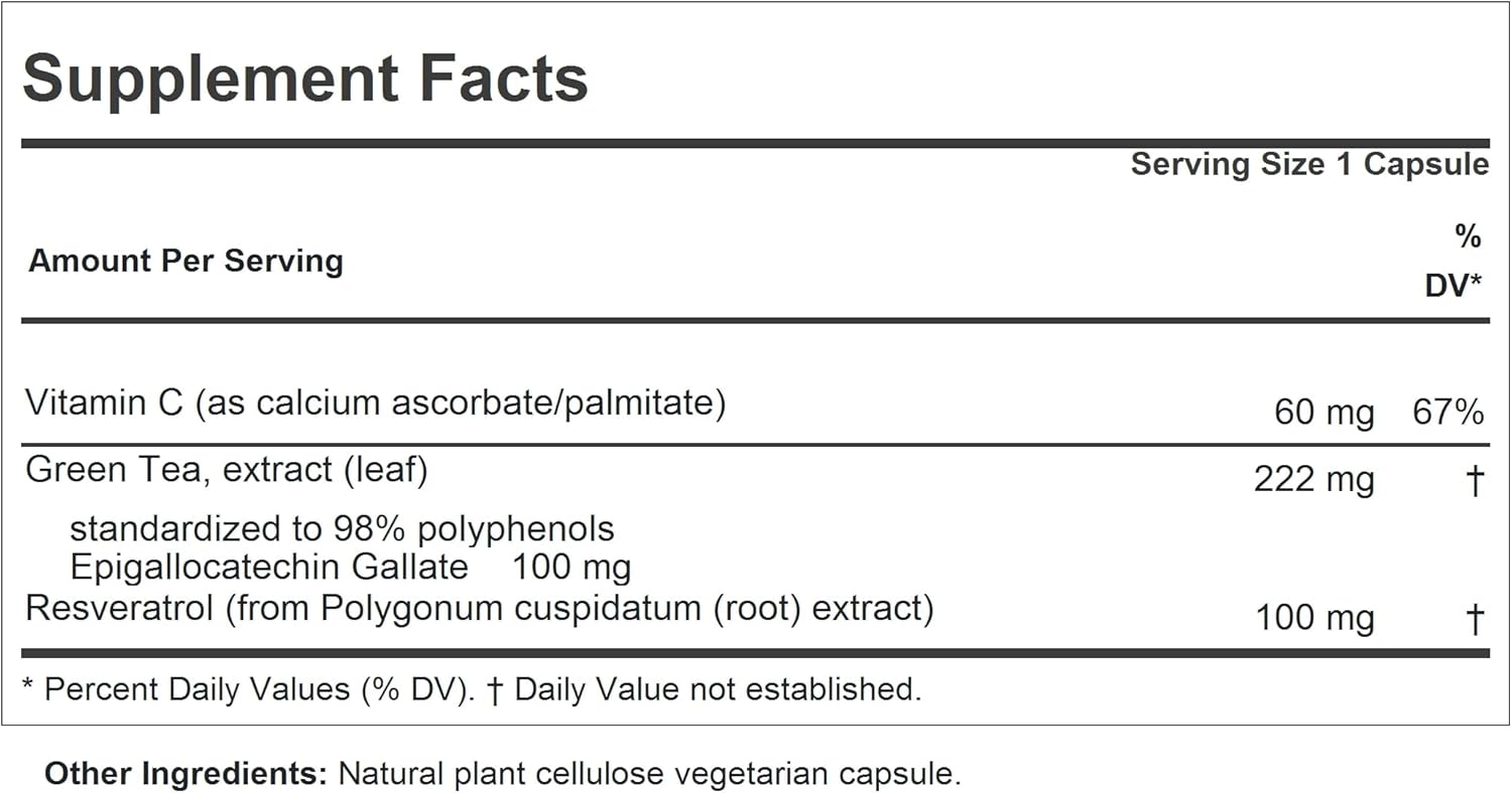 Superior, Pure Bio-Active Ingredients - Provides optimum levels of Resveratrol from Red Wine and EGCG from Green Tea. Also: Vitamin C. Contains no Milk / Dairy-Free, Gluten-Free; no soy, yeast, corn, wheat, sodium, salt, sugar, fat, cholesterol, color, preservative, common allergens or manufacturing additives