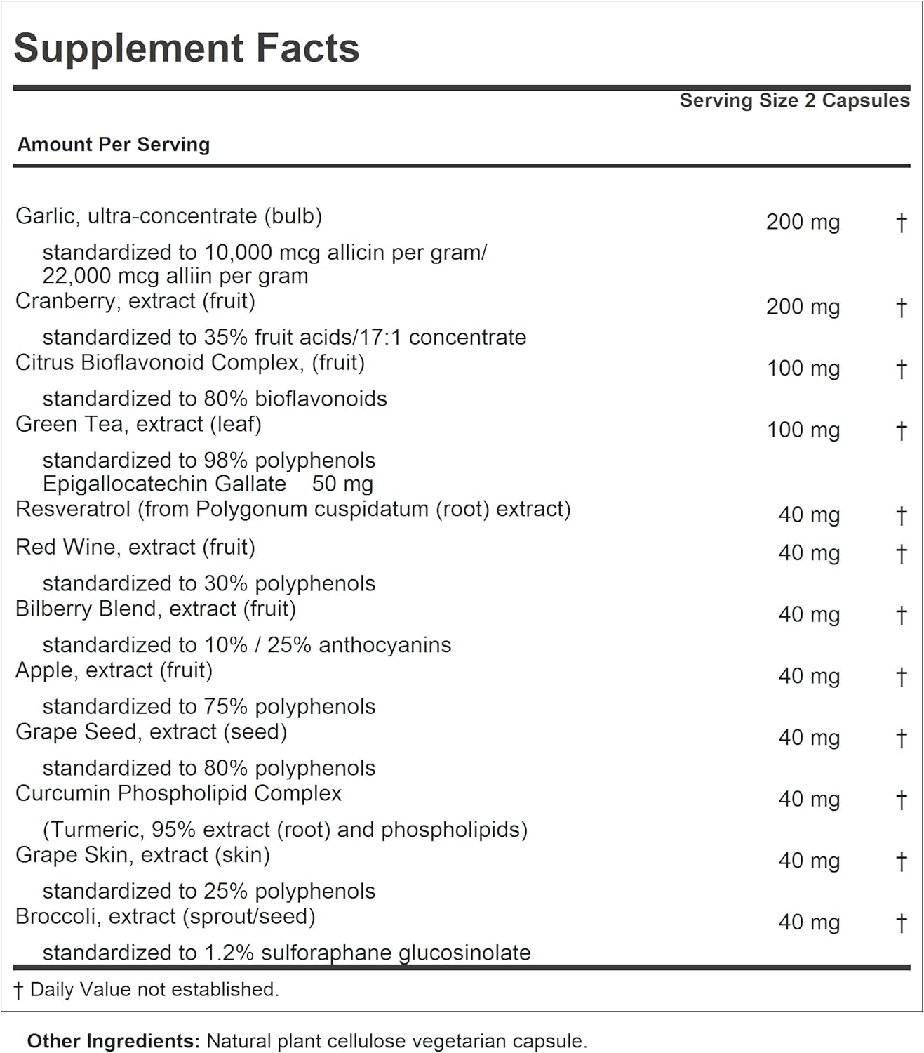 Superior pure bio-active ingredients - Delivers high concentrates of fourteen standardized extracts, including garlic, cranberry, citrus bioflavonoid, green tea, resveratrol, red wine, bilberry, apple, grape seed, curcumin, grape seed and broccoli. Contains no Milk / Dairy-Free, Gluten-Free; no soy, yeast, wheat, sodium, salt, sugar, fat, cholesterol, preservative, common allergens or manufacturing additives