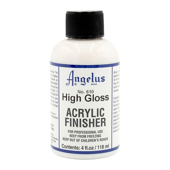Angelus No. 610 High Gloss Acrylic Finisher (4 oz) is a clear, water‑based top coat engineered to deliver a brilliant, professional-grade shine on smooth leather surfaces. Designed to protect painted leather from minor scratches, scuffs, and wear, it cures to a high-gloss, water-resistant finish that won’t rub off, crack, peel, or streak once dry Applying easily with a sponge, rag, sheep’s wool, brush, or spray gun, it requires no buffing and cleans up effortlessly with soap and water Compared to the original #600 finisher, the #610 delivers a deeper gloss with a firmer film, making it especially well suited to rigid items like shoes, handbags, saddlery, and luggage—though caution is advised for very soft leathers, where the harder finish may risk cracking Durable, flexible, and easy to use, Angelus 610 is ideal for both handcrafted artistry and high-volume production applications, providing clear, long-lasting beauty and protection