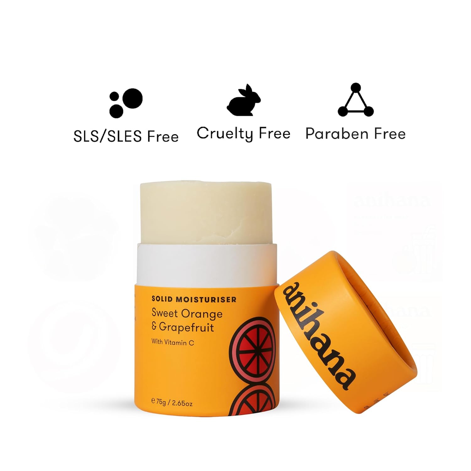 About this item MOISTURIZING: Anihana Sweet Orange & Grapefruit Solid Moisturizer nourishes and softens your skin with the goodness of coconut oil and vitamin C.The scent of sweet orange & grapefruit makes self-care a little more relaxing and enjoyable every day NATURAL INGREDIENTS: Made with all natural ingredients including Cocoa Butter & Coconut Oil to gently moisturize and care for your skin WARM & ENJOY: Our solid moisturizers are best used on warm, dry skin straight after a shower or bath. Push the tube up with your thumb and apply to skin, using your hands to massage in. The moisturizer may soften during transit in hotter months, simply pop in the fridge for a few hours to harden. Store out of direct sunlight ECO-FRIENDLY: Anihana Body Wash Bar packaging is designed to be home compostable. This eco-friendly choice helps eliminate waste in landfills and minimizes the environmental impact of the product's packaging. The added bonus is each moisturizer is equal to 2 x 250 ml lotions! HIGH QUALITY: New Zealand brand, Anihana, crafts quality bath, body and hair care products without leaving a lasting impact on the environment. All Anihana products contain safe and sustainable ingredients, are cruelty-free and free of parabens and SLS See more product details,MOISTURIZING: Anihana Sweet Orange & Grapefruit Solid Moisturizer nourishes and softens your skin with the goodness of coconut oil and vitamin C.The scent of sweet orange & grapefruit makes self-care a little more relaxing and enjoyable every day,NATURAL INGREDIENTS: Made with all natural ingredients including Cocoa Butter & Coconut Oil to gently moisturize and care for your skin,WARM & ENJOY: Our solid moisturizers are best used on warm, dry skin straight after a shower or bath. Push the tube up with your thumb and apply to skin, using your hands to massage in. The moisturizer may soften during transit in hotter months, simply pop in the fridge for a few hours to harden. Store out of direct sunlight,ECO-FRIENDLY: Anihana Body Wash Bar packaging is designed to be home compostable. This eco-friendly choice helps eliminate waste in landfills and minimizes the environmental impact of the product's packaging. The added bonus is each moisturizer is equal to 2 x 250 ml lotions!,HIGH QUALITY: New Zealand brand, Anihana, crafts quality bath, body and hair care products without leaving a lasting impact on the environment. All Anihana products contain safe and sustainable ingredients, are cruelty-free and free of parabens and SLS