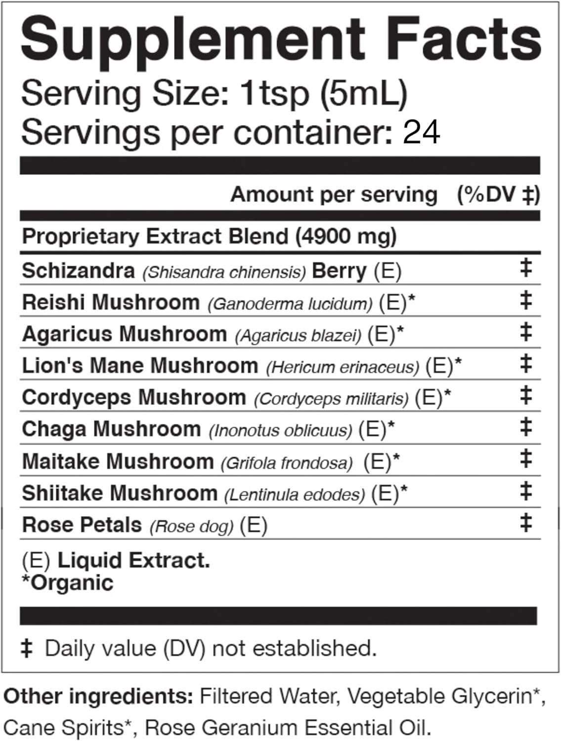 Ingredients - Reishi (Ganoderma lucidum) Mushroom (E)*, Agaricus (Agaricus blazei) Mushroom (E)*, Lion's Mane (Hericum erinaceus) Mushroom (E)*, Cordyceps (Cordyceps militaris) Mushroom (E)*, Chaga (Inonotus oblicuus) Mushroom (E)*, Maitake (Grifola frondosa) Mushroom (E)*, Shiitake (Lentinula edodes) Mushroom (E)*, Schisandra (Schisandra chinensis) Berry (E)^, Rose (Rosa canina) Petals (E)^