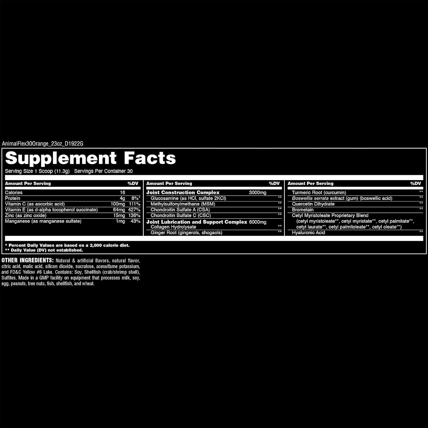 DESCRIPTION : Animal Flex All-in-one Complete Joint Supplement, Turmeric Root Curcumin, Collagen, Glucosamine Chondroitin, MSM, Hyaluronic Acid, Repair and Restore, 30 Scoops, PowderOrange