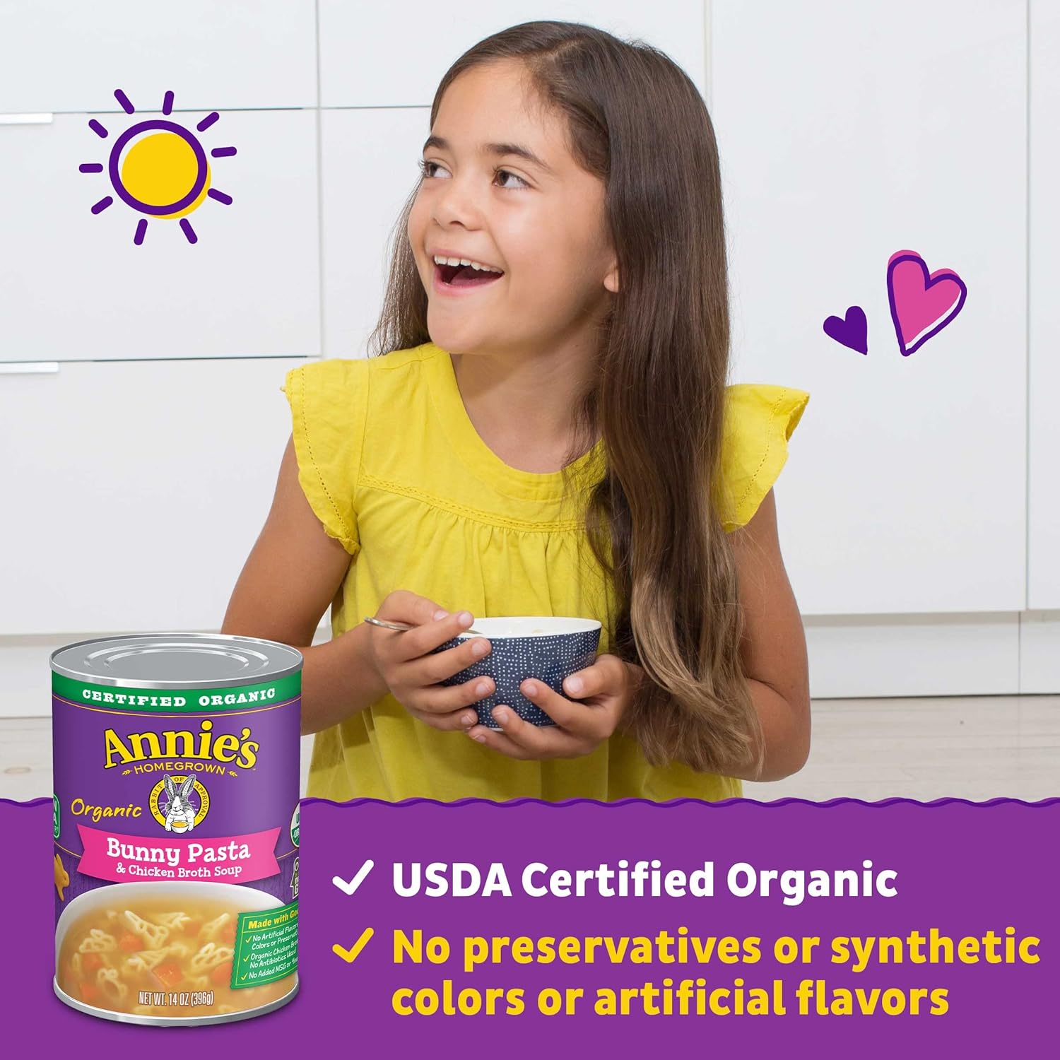 Annie's Organic Bunny Pasta and Chicken Broth Soup is canned food you can feel good about. Made with organic chicken broth, this ready to eat soup features bite-size carrot pieces and bunny-shaped pasta that kids love. It's great as part of a quick and easy dinner on busy weeknights or as a tasty side. And like all Annie's canned soups, it's made with goodness. That means no artificial flavors, synthetic colors or preservatives. Pair with Annie's Cheddar Bunnies to add more fun to lunch or dinner. This soup has no added MSG or yeast extract. Annie's makes products in over 20 family-friendly categories, from fruit-flavored snacks and cereal to mac and cheese. For busy bunnies and families on the go, we help make life a little easier and more delicious by spreading goodness through tasty foods and kindness to the planet,ORGANIC CHICKEN BROTH: This canned soup is made with organic chicken broth - no antibiotics used,FUN BUNNY SHAPES: The bunny-shaped pasta in this Annie's soup is fun and yummy addition to any lunch or dinner,WHOLESOME INGREDIENTS: No artificial flavors, synthetic colors or preservatives; No added MSG or yeast extract,ORGANIC: Made with certified organic ingredients for the goodness you'd expect from Annie's soups,CONTAINS: One 14 oz can of Annie's Organic Bunny Pasta and Chicken Broth Soup