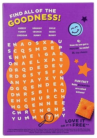 About this item CHEDDAR SQUARES: Grab a box of Annie's Organic Cheddar Squares for an easy; cheesy organic snack MADE WITH REAL CHEESE: Enjoy these yummy cheese crackers made with real cheese SNACKS FOR EVERYBUNNY: These crackers are perfect for kids' snacks; after school snacks and work snacks WHOLESOME INGREDIENTS: No artificial flavors or synthetic colors; Certified organic ingredients CONTAINS: One 7.5 oz box of Annie's Organic Cheddar Squares See more product details,CHEDDAR SQUARES: Grab a box of Annie's Organic Cheddar Squares for an easy; cheesy organic snack,MADE WITH REAL CHEESE: Enjoy these yummy cheese crackers made with real cheese,SNACKS FOR EVERYBUNNY: These crackers are perfect for kids' snacks; after school snacks and work snacks,WHOLESOME INGREDIENTS: No artificial flavors or synthetic colors; Certified organic ingredients,CONTAINS: One 7.5 oz box of Annie's Organic Cheddar Squares