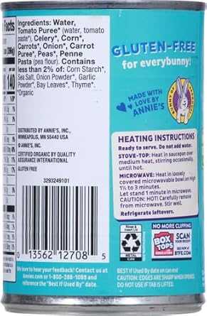 Annie'S Organic Gluten Free Vegetable Soup With Pasta Is A Tasty Way For You And Your Family To Get Their Vegetables. Every Serving Of This Organic Gluten Free Soup Gives You One Cup Of Vegetables. Ready In Minutes, This Delicious Soup Can Be Heated On The Stove Or In The Microwave. Carefully Crafted With Ingredients Like Organic Celery, Corn And Carrots, This Instant Soup Is Full Of Rich Vegetable Flavor. And Like All Annie'S Canned Food, It'S Made With Goodness. That Means No Artificial Flavors, Synthetic Colors Or High-Fructose Corn Syrup. Annie'S Makes Products In Over 20 Family-Friendly Categories ā From Fruit-Flavored Snacks And Cereal To Mac & Cheese. For Busy Bunnies And Families On The Go, We Help Make Life A Little Easier And More Delicious By Sweetening Up Packed Lunches Or By Adding To A Savory, Yummy Dinner. AnnieāS Is Devoted To Spreading Goodness Through Nourishing, Tasty Foods And Kindness To The Planet