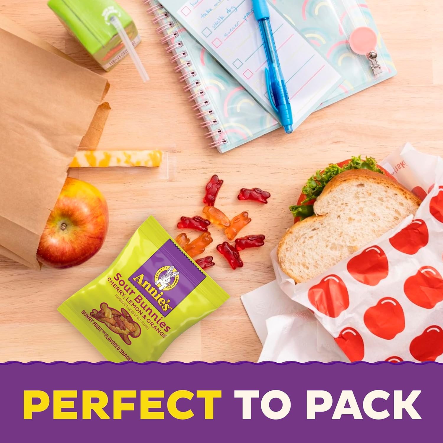 Every pouch of Annie’s Sour Bunnies Fruit Flavored Snacks brings you an irresistible sweet & sour mix of cherry, lemon, and orange flavored bunnies. These snackable, lunch packable bunny-shaped gummies are vegan, gelatin free, and gluten free. They’re made with organic fruit juice*, no artificial flavors or synthetic colors, and no high-fructose corn syrup - just yummy bites bursting with sweet n’ sour fun that provide the right amount of pucker-y punch. The convenient snack pouches make it easy to share the yummy goodness with everybunny. A perfect fruit flavored snack for the pantry, school snack tote, and on the go. Make them your favorite after school nibble. Hand them out as team treats. However you enjoy them, Annie’s helps make life a little easier and more delicious by spreading goodness through tasty foods and kindness to the planet. *These fruit flavored snacks are made with organic pear juice concentrate. See nutrition panel for a complete list of ingredients. They are not intended to replace fruit or vegetables in the diet,MADE WITH REAL FRUIT JUICE: Bunny-shaped fruit flavored snacks made with organic pear juice concentrate’ See nutrition panel for a complete list of ingredients; They are not intended to replace fruit or vegetables in the diet,SWEET & SOUR: An irresistible sweet & sour mix of cherry, lemon, and orange flavored bunnies in every pouch; These yummy gummies bring a just-right amount of pucker-y punch,INGREDIENT GOODNESS: Annie’s gluten free Sour Bunnies snacks are vegan and gelatin free; No artificial flavors or synthetic colors, and no high-fructose corn syrup,ENDLESS OPTIONS: Perfect for the pantry, lunch box, and on the go; Stock these snacks for after school and team treats that bring out the smiles,CONTAINS: One 7 oz box of Annie's Sour Bunnies Fruit Flavored Snacks; 10 pouches