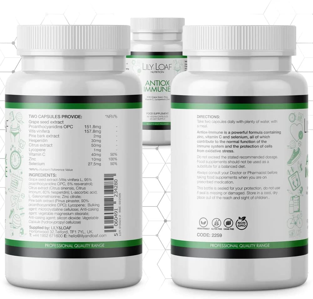 Product description How will Antiox-Immune help me Your immune system is your body’s first line of defence against infections, so make sure you’re giving your body what it needs to tackle those invaders. Antiox-Immune contains zinc and vitamin C and selenium, all of which contribute to the normal function of the immune system and the protection of cells from oxidative stress. Our formula also contains lycopene which is a powerful antioxidant which supports vascular health. Lycopene is a plant nutrient with fantastic antioxidant properties. It is a naturally occurring chemical which gives fruit and vegetables their red colour. Grapeseed Extract supports your cardiovascular and immune health and contains an array of polyphenols and flavonoids. Polyphenols are micronutrients that come from certain foods, which are packed full of antioxidants offering potential health benefits. Ingredients Grape seed extract (Vitis vinifera L., 95% proanthocyanidins OPC, 5% resveratrol); Citrus extract (Citrus sinensis, Citrus limonum, 60% hesperidin); L-ascorbic acid; L -Selenomethionine; Zinc citrate; Pine bark dry extract (Pinus pinaster, 90% proanthocyanidins OPC); Lycopene; Bulking agent: microcrystalline cellulose; Anti-caking agent: vegetable magnesium stearate; Anti-caking agent: silicon dioxide P.when('A').execute(function(A) { A.on('a:expander:toggle_description:toggle:collapse', function(data) { window.scroll(0, data.expander.$expander[0].offsetTop-100); }); }); Directions Take two capsules daily with plenty of water, with a meal. Safety Warning Food supplements should not be used as a substitute for a balanced diet. Always consult your Doctor or Pharmacist before taking food supplements when you are on prescribed medication, or pregnant/planning to become pregnant. See more,COMPREHENSIVE FORMULA: A premier formula for the immune system,ANTIOXIDANT RICH: Zinc, Selenium, Vitamin C, Lycopene and Grapeseed Extract all protect your cells from oxidative stress - not one of us who escapes from free radical damage daily,SUITABLE FOR: Vegetarians & Vegans