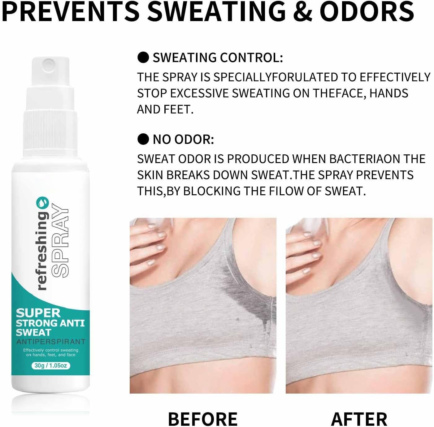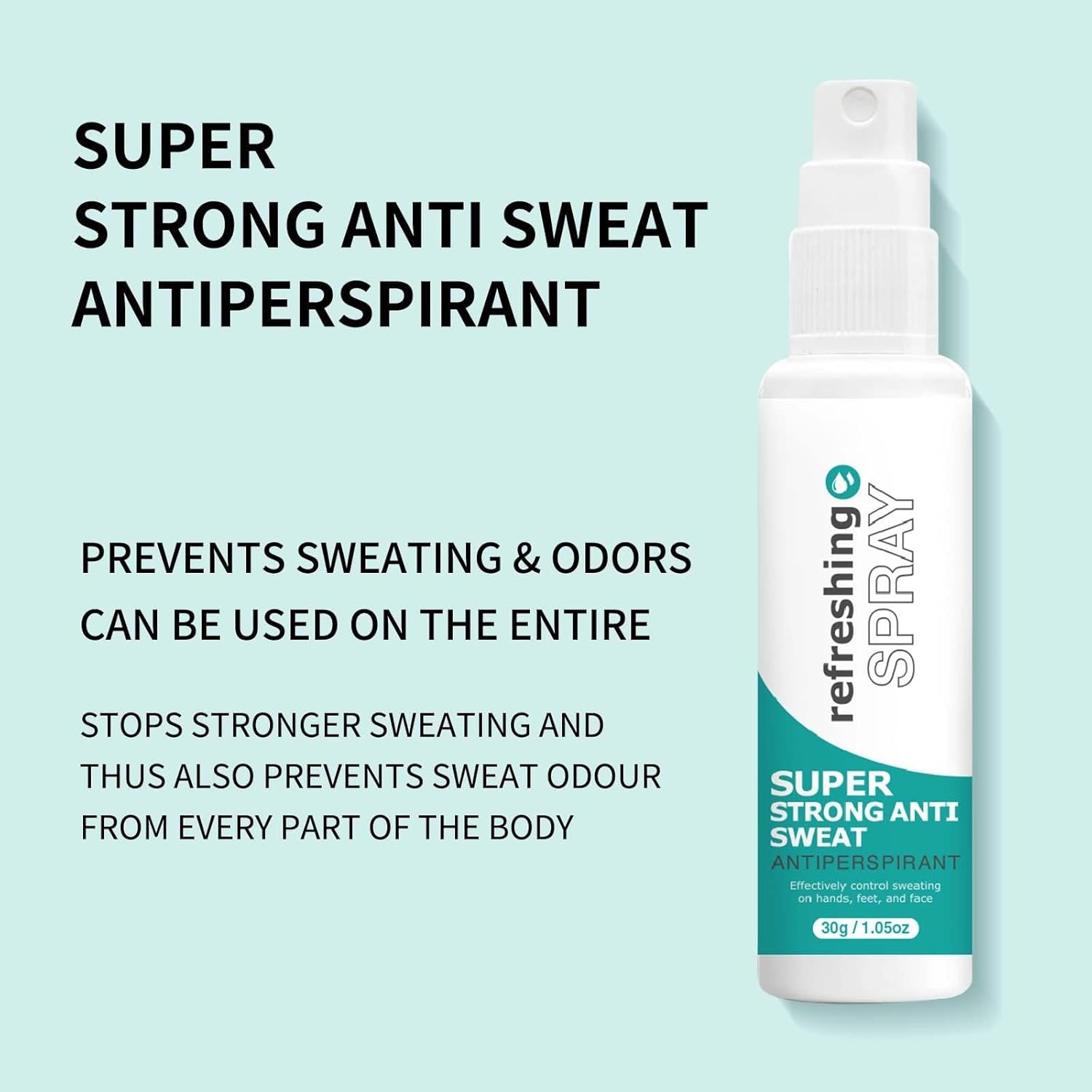 Product description Net Content: 30ml Includes: 1* Antiperspirant Deodorant Spray Safety Warning No,Antiperspirant spray can also prevent more intense sweating, thus preventing the smell of sweat from any part of the body,Ideal for face, hands, feet, axis, upper lip, back, chest, bent arms, kneecaps, thighs, buttocks and intimate areas. Very suitable for scalp and other sensitive parts,Antiperspirant spray can prevent your hands and feet from sweating excessively and keep you dry and fresh all day,It can keep you fresh and clean all day without leaving white spots on your skin or clothes,Simple to use: Apply the antiperspirant spray to dry skin before going to bed at night and let it soak completely to avoid discoloration. Usually only once or twice a week. Sweat spray off is very effective