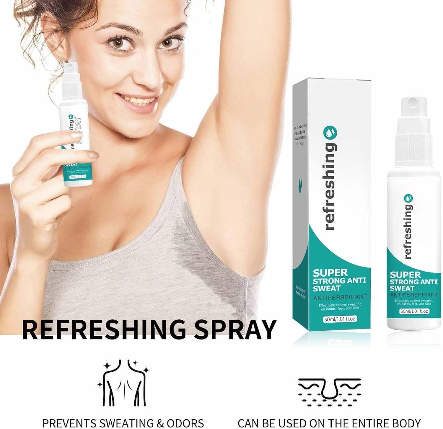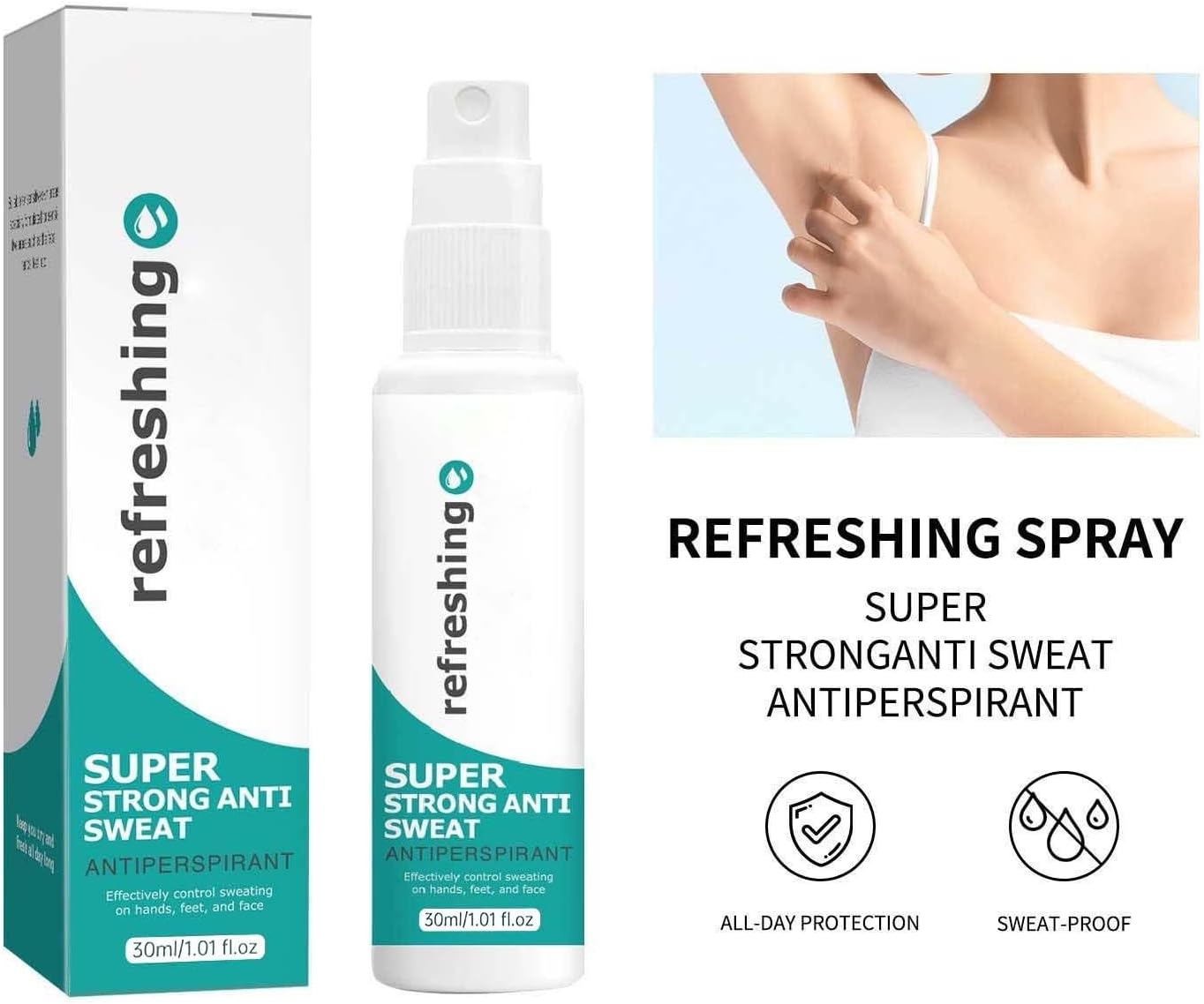Product description Net Content: 30ml Includes: 1* Antiperspirant Deodorant Spray Safety Warning No,Antiperspirant spray can also prevent more intense sweating, thus preventing the smell of sweat from any part of the body,Ideal for face, hands, feet, axis, upper lip, back, chest, bent arms, kneecaps, thighs, buttocks and intimate areas. Very suitable for scalp and other sensitive parts,Antiperspirant spray can prevent your hands and feet from sweating excessively and keep you dry and fresh all day,It can keep you fresh and clean all day without leaving white spots on your skin or clothes,Simple to use: Apply the antiperspirant spray to dry skin before going to bed at night and let it soak completely to avoid discoloration. Usually only once or twice a week. Sweat spray off is very effective