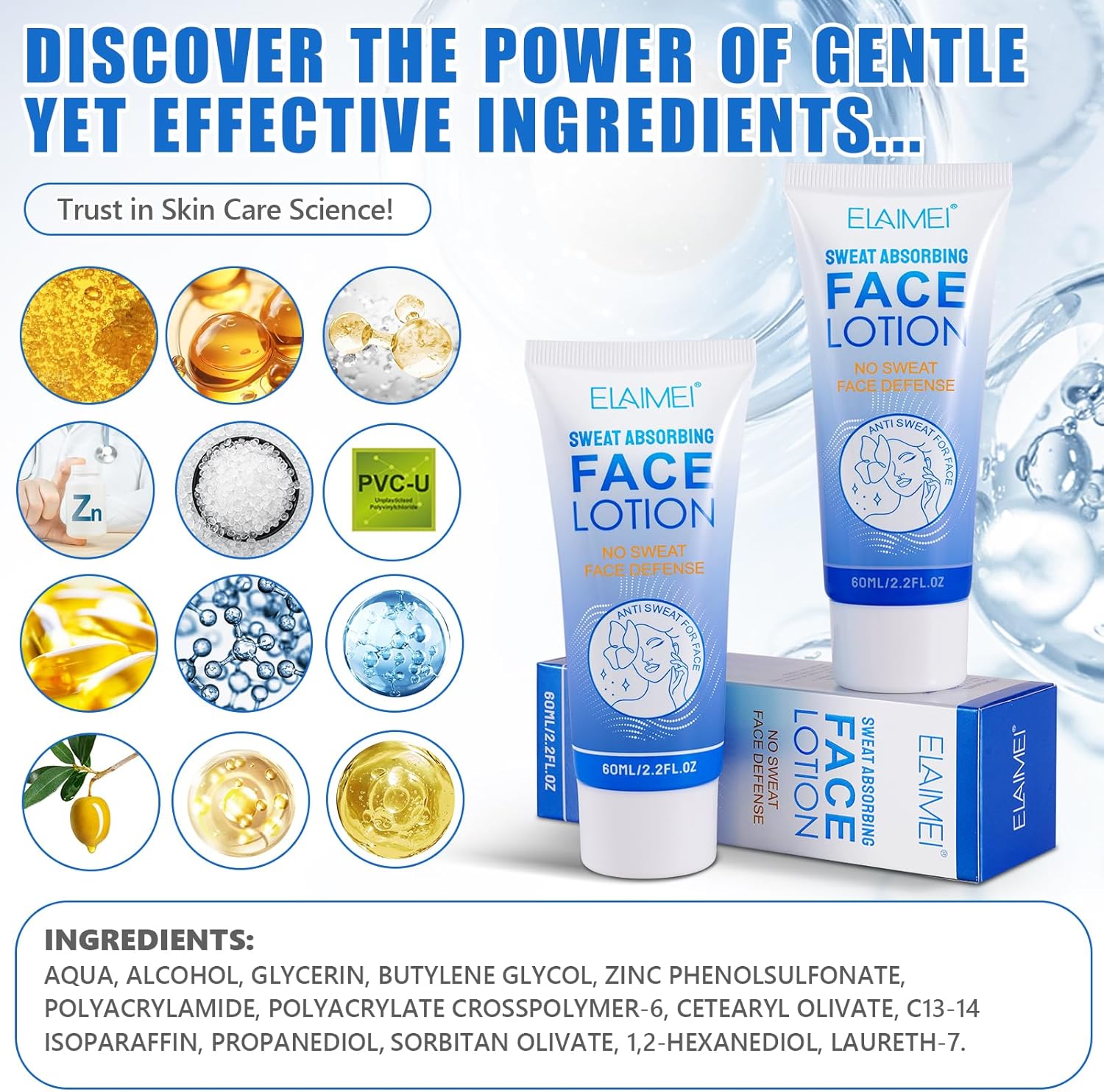 About The Product : ?No Sweat Face Defense?Our Sweat Absorbing Face Lotion is the solution to help men and women control sweating and facial perspiration; also helps reduce the appearance of upper lip sweat, forehead sweat and sweaty scalp. It is ideal for all skin types. No residue on the face, no stickiness - ideal for use under make-up and sunscreen on the face