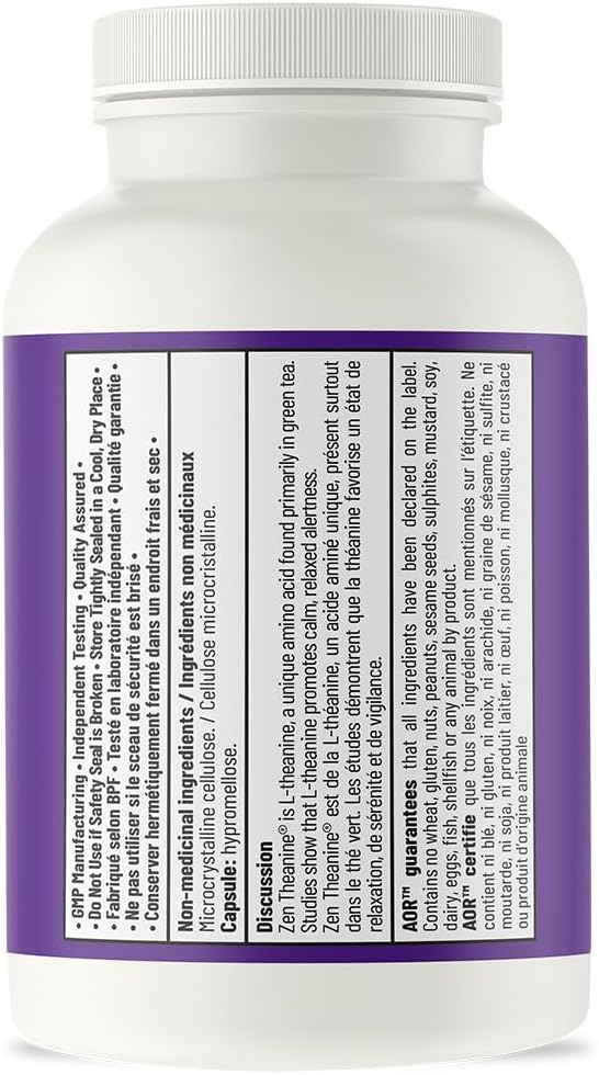 About this item PURE L-THEANINE: Studies show that L-theanine (an amino acid found in green tea) helps promote a calm, relaxed alertness without drowsy side effects. RELAXED AND PEACEFUL: Theanine helps support the same alpha-brain wave activity that's often experienced during meditation. FAST-ACTING AND EFFECTIVE: Each capsule contains an optimal, fast-acting dose of L-theanine to help reduce daily stress; Aids mood support and cognitive function. NATURAL QUALITY: Contains no wheat, corn, nuts, peanuts, soy, dairy, eggs, fish, shellfish, or any animal byproduct; Gluten free and non-GMO; Take daily. WHAT WE STAND FOR: Advanced Orthomolecular Research (AOR) puts pharmaceutical principles into practice to create high-quality products for your individual nutritional needs. See more product details,PURE L-THEANINE: Studies show that L-theanine (an amino acid found in green tea) helps promote a calm, relaxed alertness without drowsy side effects,RELAXED AND PEACEFUL: Theanine helps support the same alpha-brain wave activity that's often experienced during meditation,FAST-ACTING AND EFFECTIVE: Each capsule contains an optimal, fast-acting dose of L-theanine to help reduce daily stress; Aids mood support and cognitive function,NATURAL QUALITY: Contains no wheat, corn, nuts, peanuts, soy, dairy, eggs, fish, shellfish, or any animal byproduct; Gluten free and non-GMO; Take daily,WHAT WE STAND FOR: Advanced Orthomolecular Research (AOR) puts pharmaceutical principles into practice to create high-quality products for your individual nutritional needs