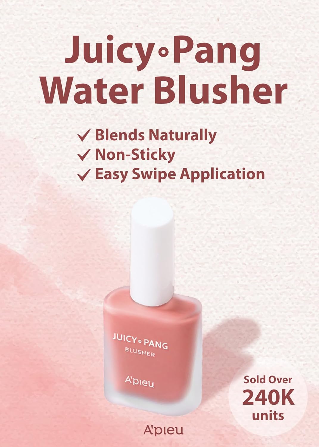 About this item Juicy Liquid Blusher for Fresh Glow: Lightweight water-based blush delivers a natural flush with just a few drops. Easy to blend with fingers or tools for a healthy, dewy look that lasts. Soft Water-Based Formula: The lightweight water texture spreads effortlessly and absorbs quickly into the skin. Gives a sheer, dewy flush without clogging pores or feeling sticky. Seamless Fit Without Caking: Blends into the skin without leaving any patchiness. Lightweight formula sits comfortably on textured or uneven skin for a smooth, clean finish. Layerable & Easy to Use:Perfect for beginners and pros alike—buildable coverage allows soft or bold looks. Use fingers or sponges for a seamless finish. Shake well before use. About A’pieu: A’pieu blends gentle, youthful skincare innovation with trendy K-beauty color makeup. Loved for its playful, effective formulas that enhance natural beauty. See more product details,Juicy Liquid Blusher for Fresh Glow: Lightweight water-based blush delivers a natural flush with just a few drops. Easy to blend with fingers or tools for a healthy, dewy look that lasts,Soft Water-Based Formula: The lightweight water texture spreads effortlessly and absorbs quickly into the skin. Gives a sheer, dewy flush without clogging pores or feeling sticky,Seamless Fit Without Caking: Blends into the skin without leaving any patchiness. Lightweight formula sits comfortably on textured or uneven skin for a smooth, clean finish,Layerable & Easy to Use:Perfect for beginners and pros alike—buildable coverage allows soft or bold looks. Use fingers or sponges for a seamless finish. Shake well before use,About A’pieu: A’pieu blends gentle, youthful skincare innovation with trendy K-beauty color makeup. Loved for its playful, effective formulas that enhance natural beauty