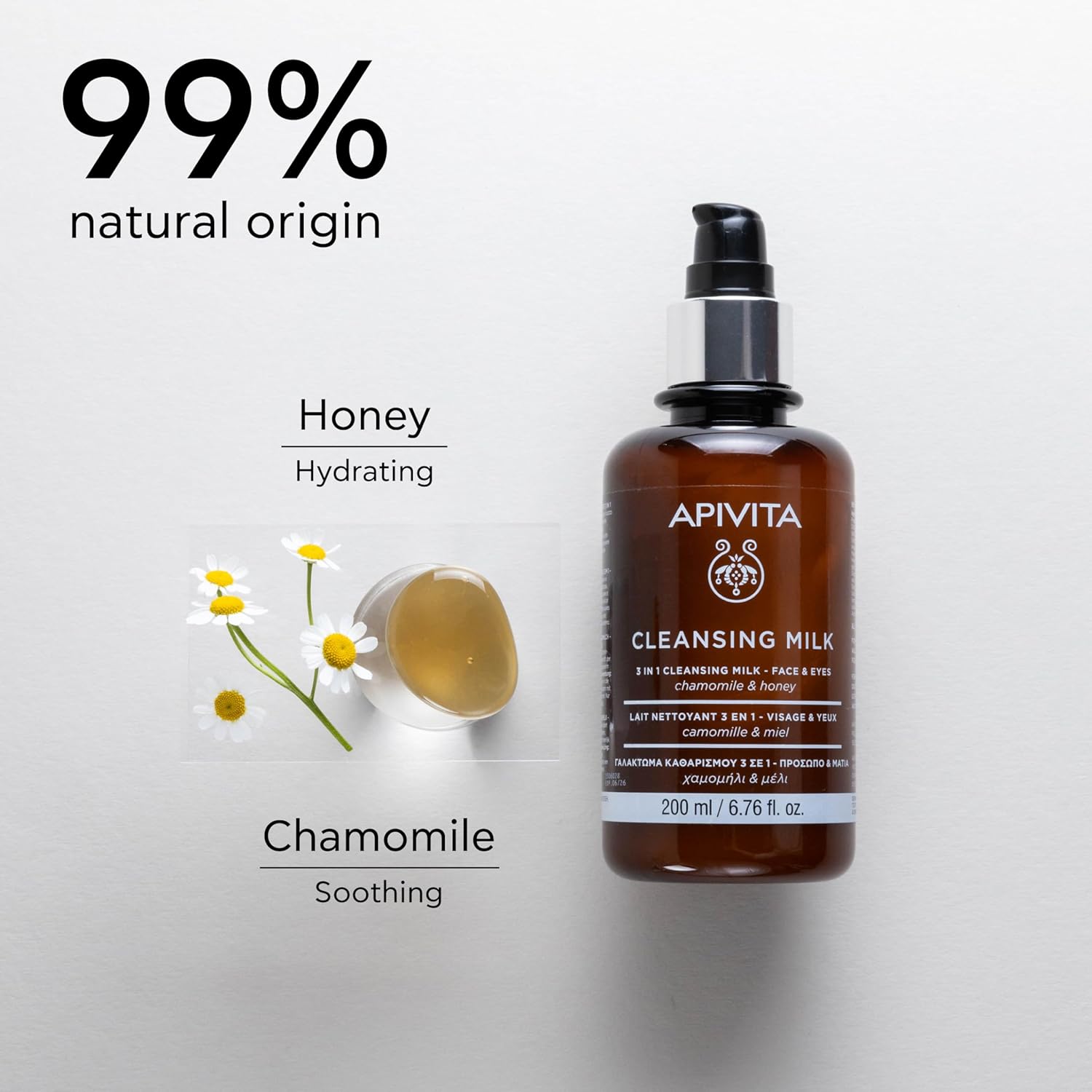 Apivita Cleansing Milk | Hydrating & Smoothing 3-in-1 Cleansing Milk Face & Eye Cleanser + Makeup Remover with Chamomile & Honey, 200 mL / 6.67 oz
