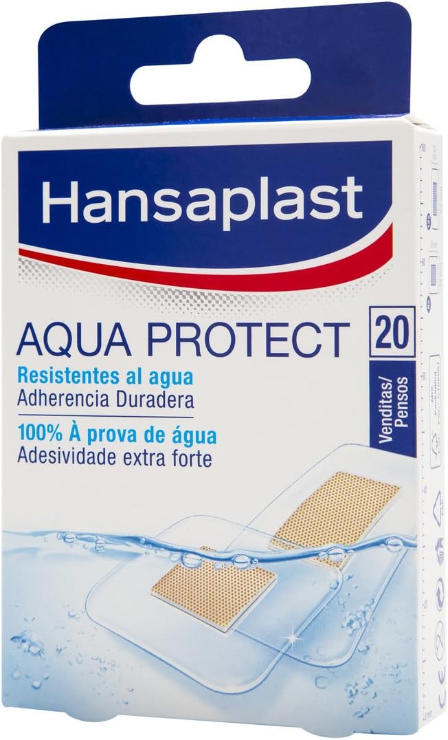 About this item Superficial injuries - Protect your small wounds with these adhesive patches that keep your wounds clean in any situation. Protective compress - The non-adhesive dressing integrated into the plaster forms a pad that protects the injury of bacteria and other impurities. Waterproof wound plasters – these plasters protect your superficial wounds even when washing hands or showering. Instructions for use: clean and disinfect your wound, dry the skin carefully. Apply the patch without stretching it and avoiding wrinkles. Hansaplast Aqua Protect 40 Plasters, Hypoallergenic Plasters with Strong Adhesion, Box of 40 Plasters, Item Number: Hansaplast_4 › See more product details,Superficial injuries - Protect your small wounds with these adhesive patches that keep your wounds clean in any situation,Protective compress - The non-adhesive dressing integrated into the plaster forms a pad that protects the injury of bacteria and other impurities,Waterproof wound plasters – these plasters protect your superficial wounds even when washing hands or showering,Instructions for use: clean and disinfect your wound, dry the skin carefully. Apply the patch without stretching it and avoiding wrinkles,Hansaplast Aqua Protect 40 Plasters, Hypoallergenic Plasters with Strong Adhesion, Box of 40 Plasters, Item Number: Hansaplast_4