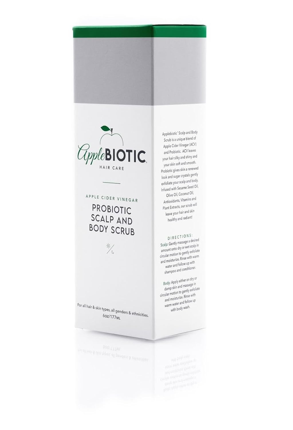 Introducing Applebiotic Apple Cider Vinegar Probiotic Scalp and Body Scrub โ a new revolutionary solution to exfoliate, hydrate, and balance your scalp. HEALTHY SCALP = HEALTHY HAIR We take care of our hair and face. But have much time do we invest in caring for our scalp Regularly detoxing and exfoliating our scalp doesn't just prevent grease, dead skin, and hair-loss-causing product residues from clogging pores; it provides a healthy environment for lush hair to grow faster, thicker, and stronger. NOT EVERY SCALP SCRUB IS EQUAL We set out to select the highest quality, most gentle, yet effective ingredients. Our focus was to formulate a clean, color-safe product as preservatives and additives further irritate the scalp's sensitive skin. Apple Cider Vinegar - to balance the scalps pH level, soothe and break down product buildup Niacinimide - as an antioxidant, it helps to regulate oil production and works to refresh skin and hair by helping with moisture retention Olive Fruit Oil - helps to renew skin cells and moisturizes the scalp Sesame Seed Oil - rich in Vitamin E, it helps to protect against environmental stressors such as UV rays, toxins, and pollution Sugar Crystals - to softly exfoliate skin and dissolve easily without leaving any residue WHO SHOULD USE A SCALP SCRUB Women, men, and teens of all ages can benefit from weekly exfoliation, particularly those who use dry shampoo, leave-in conditioners, hair spray, or hair masks. Those who enjoy an active lifestyle or live in warm climates can say goodbye to sweat and chlorine buildup and enjoy the increased softness, luster, and shine
