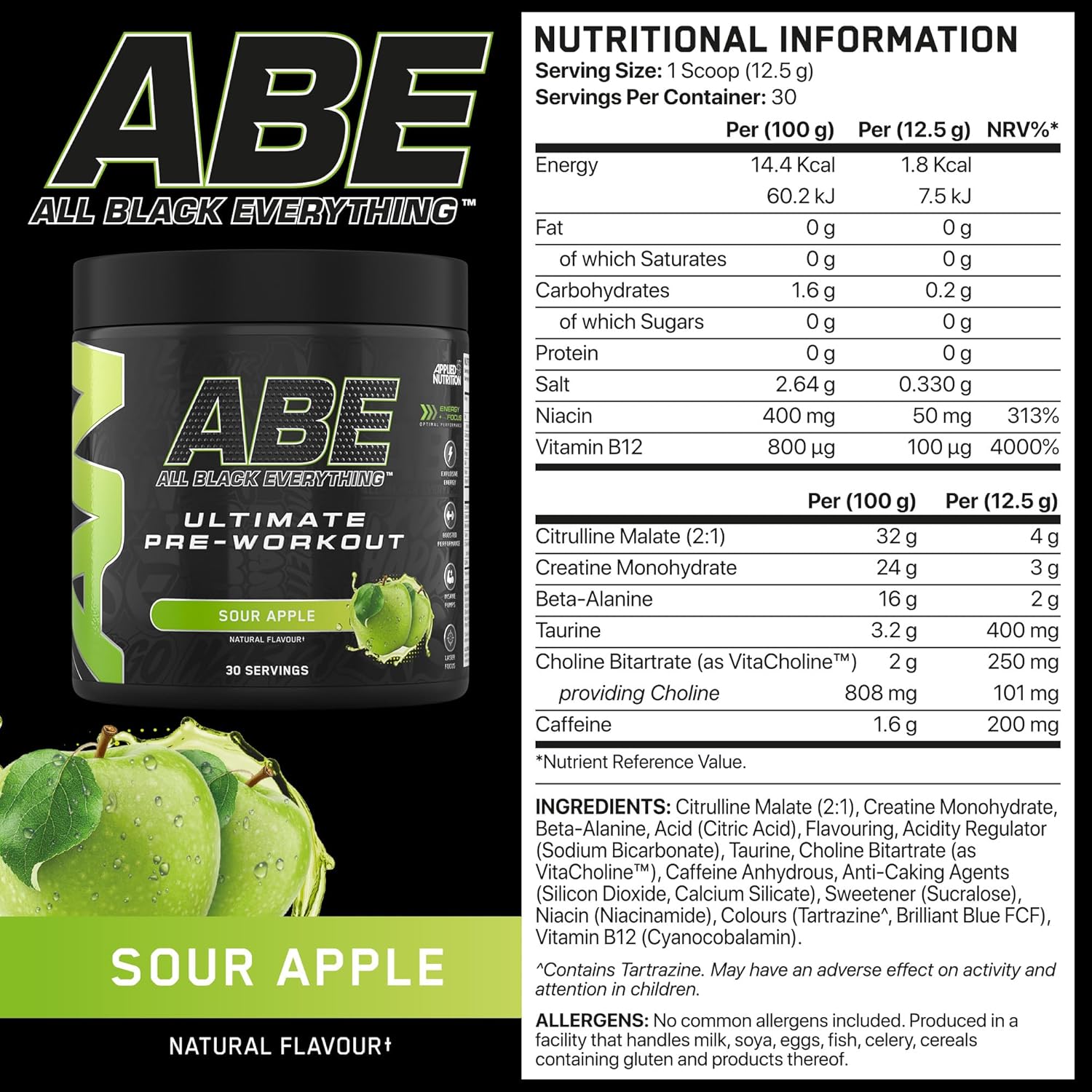 Applied Nutrition Abe Pre Workout - All Black Everything Pre Workout Powder, Energy & Physical Performance With Citrulline, Creatine, Beta Alanine (375G - 30 Servings) (Sour Apple)