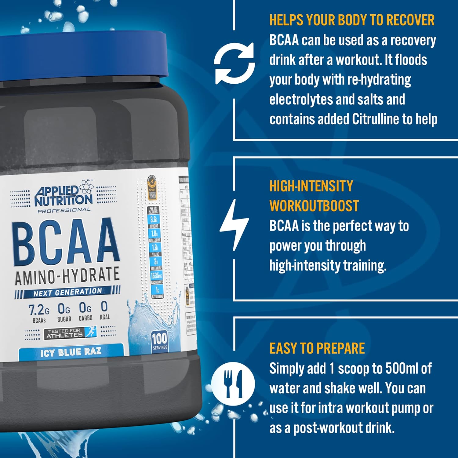 DESCRIPTION : Applied Nutrition BCAA Powder - Branched Chain Amino Acids BCAAs Supplement, Amino Hydrate Intra Workout & Recovery Energy Drink (1.4kg - 100 Servings) (Fruit Burst)