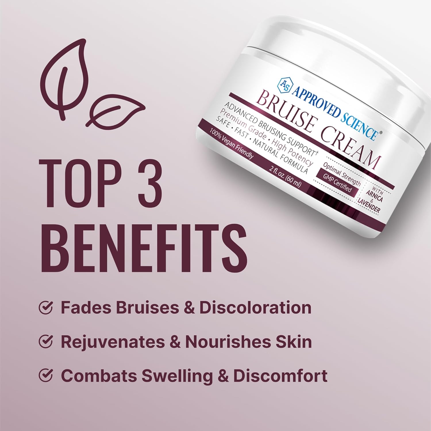 About this item Like Magic - A must have for every first aid kit, each application is packed with 100% natural ingredients, including powerful Arnica Montana Extract, to help improve the appearance of bruises. Terrific Terpenes - Bruise Cream combines Peppermint, Eucalyptus, Cassia, Hemp, and Avocado oils for an optimal 8% terpene concentration. Terpenes have the ability to lessen swelling and discomfort, as well as improve the absorption of active ingredients in the cream. Nourish and Protect - Fatty acids, Vitamin E, Beta Carotene, and Vitamin D help to nourish the bruised skin and the underlying tissues. This aids in the creation of new tissue which can help the bruise disappear. Fab Formula - Each ingredient was carefully selected by medical experts to create a solution that combines science with nature. The unique combination of ingredients and precise dosage is what makes Bruise Cream so effective. High Quality - This cream is free from preservatives, additives, artificial colors, and hormones. All Approved Science products are third-party tested and manufactured in a cGMP-certified facility in the USA. See more product details,Like Magic - A must have for every first aid kit, each application is packed with 100% natural ingredients, including powerful Arnica Montana Extract, to help improve the appearance of bruises,Terrific Terpenes - Bruise Cream combines Peppermint, Eucalyptus, Cassia, Hemp, and Avocado oils for an optimal 8% terpene concentration. Terpenes have the ability to lessen swelling and discomfort, as well as improve the absorption of active ingredients in the cream,Nourish and Protect - Fatty acids, Vitamin E, Beta Carotene, and Vitamin D help to nourish the bruised skin and the underlying tissues. This aids in the creation of new tissue which can help the bruise disappear,Fab Formula - Each ingredient was carefully selected by medical experts to create a solution that combines science with nature. The unique combination of ingredients and precise dosage is what makes Bruise Cream so effective,High Quality - This cream is free from preservatives, additives, artificial colors, and hormones. All Approved Science products are third-party tested and manufactured in a cGMP-certified facility in the USA