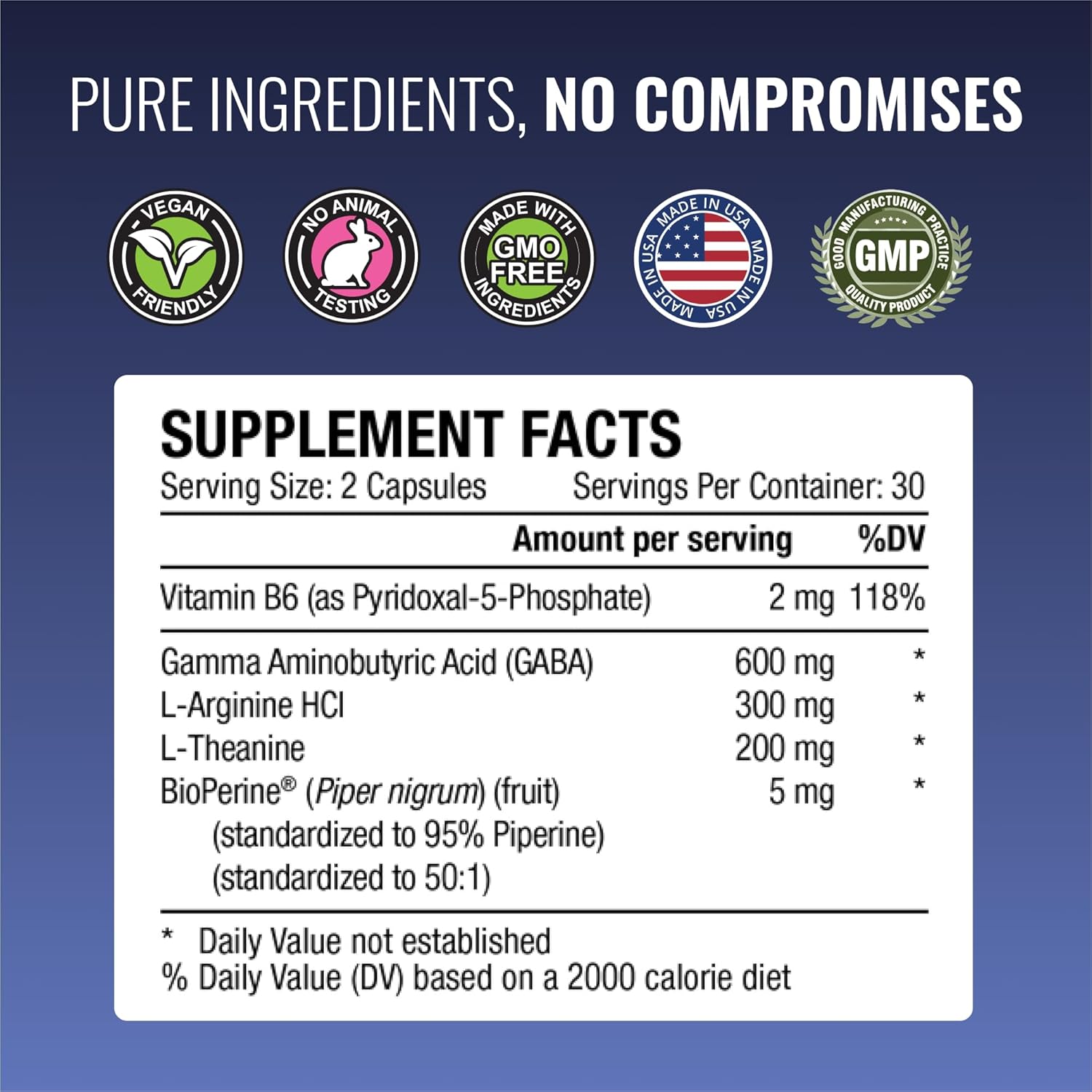 About this item Glorious GABA - Formulated with 600mg Gamma-Aminobutyric Acid (GABA) to help bring about a calm and relaxed state of mind, and help you achieve a more peaceful sleep. Amino Acid Ally - Utilizes the amino acid L-Arginine to penetrate the blood-brain barrier, which helps boost GABA levels in the brain. Support System - Contains L-Theanine to enhance the benefits of GABA, while Vitamin B6 aids the natural production of GABA. Amazingly Absorbable - Includes BioPerine to enhance absorption and help promote faster results. Top Quality - Cruelty-free, paraben-free, non-GMO, third-party tested, and made in a GMP-certified facility in the USA. See more product details,Glorious GABA - Formulated with 600mg Gamma-Aminobutyric Acid (GABA) to help bring about a calm and relaxed state of mind, and help you achieve a more peaceful sleep,Amino Acid Ally - Utilizes the amino acid L-Arginine to penetrate the blood-brain barrier, which helps boost GABA levels in the brain,Support System - Contains L-Theanine to enhance the benefits of GABA, while Vitamin B6 aids the natural production of GABA,Amazingly Absorbable - Includes BioPerine to enhance absorption and help promote faster results,Top Quality - Cruelty-free, paraben-free, non-GMO, third-party tested, and made in a GMP-certified facility in the USA