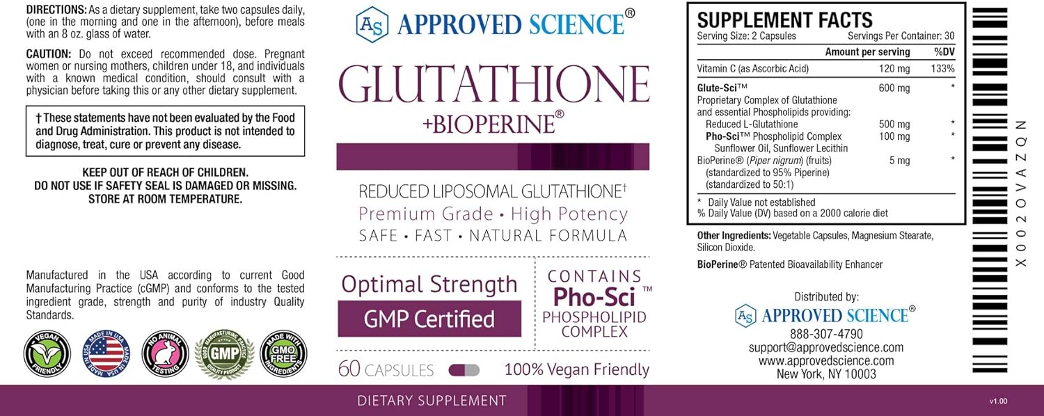 DESCRIPTION : Approved Science® Glutathione - Glutathione 500 mg - Phospholipid Complex, Vitamin C, Bioperine - Top Antioxidant to Help Neutralize Free Radical - Vegan Friendly - 60 Capsules - 1 Bottle60 Count (Pack of 1)