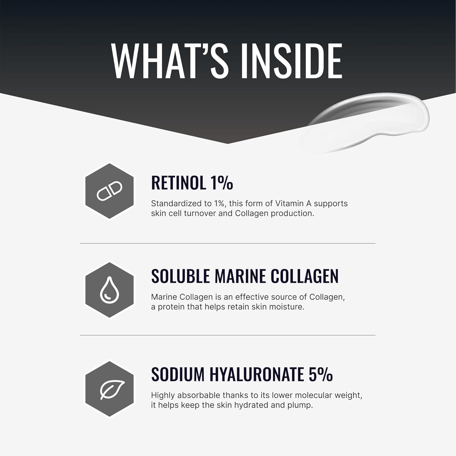About this item The One Percent - Contains an optimal standardization of 1% Retinol for a gentle yet effective formula for increasing skin cell renewal, boosting collagen production, and decreasing hyperpigmentation. Plump It Up - The powerful combination of Retinol and 5% Soluble Marine Collagen helps to plump and smooth the skin while enhancing skin tone. Hydration Sensation - Sodium Hyaluronate, the most stable and effective form of Hyaluronic Acid, deeply hydrates the skin and replenishes the moisture that is lost as we age. Jojoba Joy - Jojoba Oil exerts a soothing effect on the skin and provides antioxidants that help protect the skin against free radical and environmental damage. Renew And Rejuvenate - Works to boost the rate of skin cell turnover and combat flakiness while lessening the appearance of lines and wrinkles. See more product details,The One Percent - Contains an optimal standardization of 1% Retinol for a gentle yet effective formula for increasing skin cell renewal, boosting collagen production, and decreasing hyperpigmentation,Plump It Up - The powerful combination of Retinol and 5% Soluble Marine Collagen helps to plump and smooth the skin while enhancing skin tone,Hydration Sensation - Sodium Hyaluronate, the most stable and effective form of Hyaluronic Acid, deeply hydrates the skin and replenishes the moisture that is lost as we age,Jojoba Joy - Jojoba Oil exerts a soothing effect on the skin and provides antioxidants that help protect the skin against free radical and environmental damage,Renew And Rejuvenate - Works to boost the rate of skin cell turnover and combat flakiness while lessening the appearance of lines and wrinkles