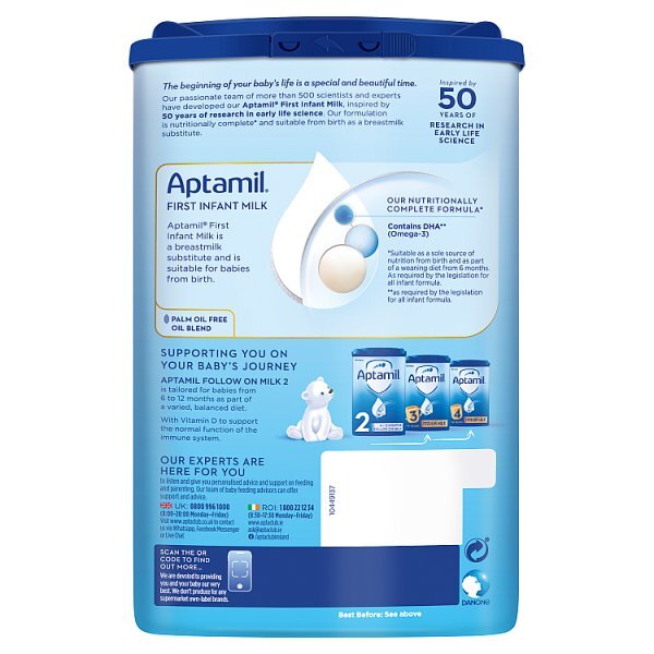Product Information:Our Unique Expertise For 40 years, we have been pioneering research in early life science with our passionate team of 400 scientists and experts. Our research has enabled us to take inspiration from the benefits of nature, to develop our unique infant formula suitable for the first months. Our Patented Formulation Our First Infant Milk developed by combining our blend of ingredients with our unique process Nucleotides, Omega-3 LCPs (DHA) Contains Omega-3 LCPs (DHA) GOS/FOS (9:1) Our patented blend of Galacto- and Fructo-oligosaccharides,Warning or Restrictions:Important notice Breastfeeding is best for babies. AptamilĀ® First Infant Milk should only be used on the advice of a doctor, midwife, health visitor, public health nurse, dietitian, pharmacist, or other professional responsible for maternal and child care. When bottle feeding do not allow prolonged or frequent contact of milk feeds with your baby's teeth as this increases the risk of tooth decay. Ask your healthcare professional or dentist for advice. Make sure your baby's teeth are cleaned after the last feed at night,Product Specification:Dairy-Based Blend (of which 29% is fermented) [Lactose (from Milk), Vegetable Oils (High Oleic Sunflower Oil, Coconut Oil, Rapeseed Oil, Sunflower Oil), Skimmed Milk, Demineralised Whey (from Milk), Whey Concentrate (from Milk), Fish Oil, Potassium Citrate, Calcium Carbonate, Magnesium Chloride, Choline Chloride, Calcium Phosphate, Sodium Citrate, Potassium Chloride, Vitamin C, Emulsifier (Soy Lecithin), Inositol, Antioxidant (Vitamin C), Pantothenic Acid, Nicotinamide, Vitamin E, Thiamin, Riboflavin, Vitamin B6, Potassium Iodide, Folic Acid, Vitamin K1, Biotin, Vitamin B12], Galacto-Oligosaccharides (GOS) (from Milk), Milk Protein, Fructo-Oligosaccharides (FOS), Oil from Mortierella Alpina, Sodium Chloride, L-Tryptophan, Ferrous Sulphate, Zinc Sulphate, L-Carnitine, Copper Sulphate, Vitamin A, Sodium Selenite, Manganese Sulphate, Vitamin D3,Product Uses:See instructions for preparation and usage