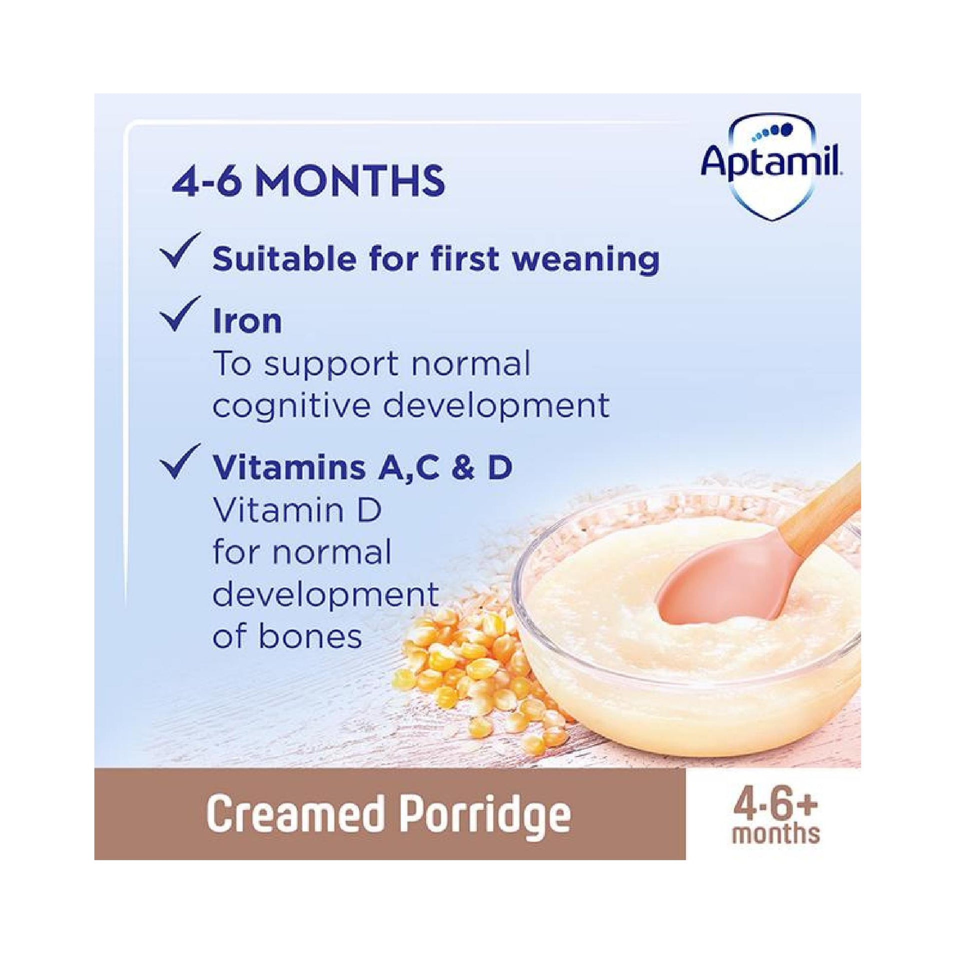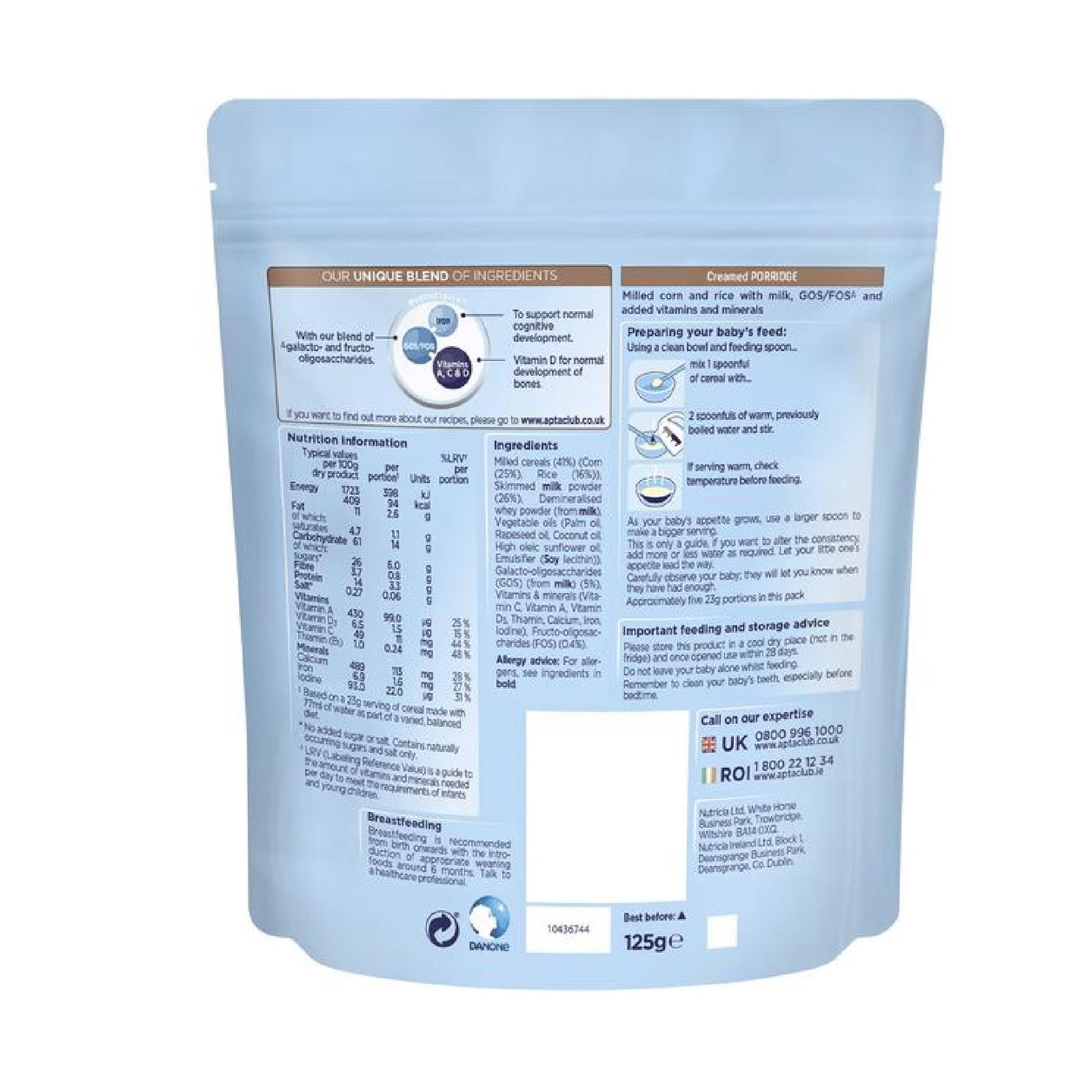 Product Description Aptamil Creamy Porridge Ingredients Cereals (41%) (Corn flour (25%), Rice flour (16%)), Skimmed milk powder (26%), Demineralised whey powder (from milk), Vegetable oils (Palm oil, Rapeseed oil, Coconut oil, High oleic sunflower oil, Emulsifier (Soy lecithin)), Galacto-oligosaccharides (GOS) (from milk) (5%), Minerals (Calcium, Iron, Iodine), Fructo-oligosaccharides (FOS) (0.4%), Vitamins (Vitamin C, Vitamin A, Vitamin D3, Thiamin).