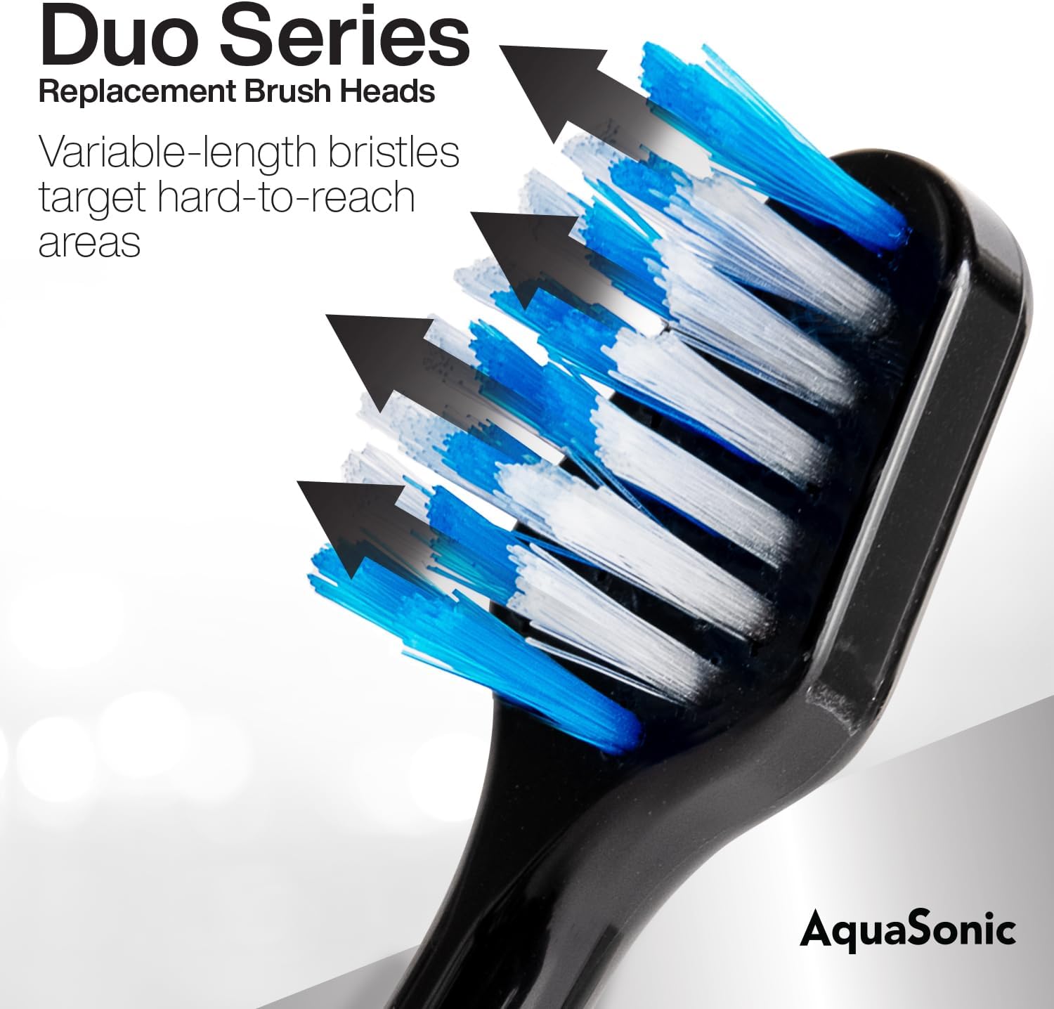 8-PACK REPLACEMENT BRUSH HEADS - Engineered by DuPont; a world leader in materials science,REPLACEMENT BRUSH HEADS: Compatible with the following toothbrush handles: Duo Series & Home Dental Center. Not compatible with Duo Series Pro. Get the best performance out of your AquaSonic toothbrush by choosing authentic AquaSonic replacement brush heads. These DuPont-engineered brush heads feature variable-length bristles to target hard-to-reach areas between teeth and along the gumline,TOP QUALITY: Made from high-quality materials, our brush heads feature bristles that are gentle on teeth and gums, yet effective at removing plaque and tartar. They are also easy to replace, making it simple to ensure you get the best cleaning performance out of your AquaSonic toothbrush,RECOMMENDATIONS: Replacing your brush head is easy and takes just seconds, ensuring that your AquaSonic toothbrush stays in top condition. Change your brush head every 3 months for optimal brushing performance. Change your brush head sooner if it becomes worn. Make sure to rinse bristles well after each use,REPUTABLE USA BRAND: AquaSonic is a U.S.-based oral care brand trusted by customers for delivering high-performance toothbrushes and water flossers. Our products reflect a deep commitment to quality, innovation, and customer satisfaction,WHAT'S IN THE BOX: 8 replacement brush heads (4 black, 4 white)