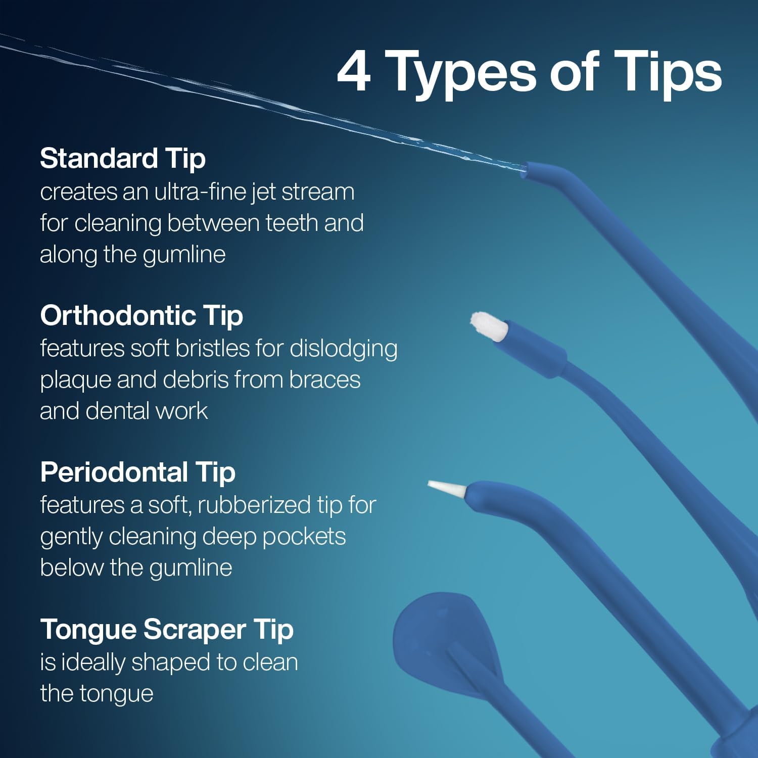 Complete Set of Water Flosser Tips: Includes 5 authentic AquaSonic replacement tips - 2 Standard Tips, 1 Periodontal Tip, 1 Orthodontic Tip & 1 Tongue Scraper for a comprehensive clean,Specialized Cleaning: Each tip is designed to target specific ares of oral hygiene, such as everyday cleaning between teeth and along the gumline, deep pockets, around braces and other dental work, and the tongue,Compatibility: This set is compatible with AquaSonic Icon Rechargeable Water Flosser,Easy Maintenance: Replace tips every 6 months to maintain optimal freshness and oral hygiene,Includes: 2 Standard Tips, 1 Orthodontic Tip & 1 Tongue Scraper