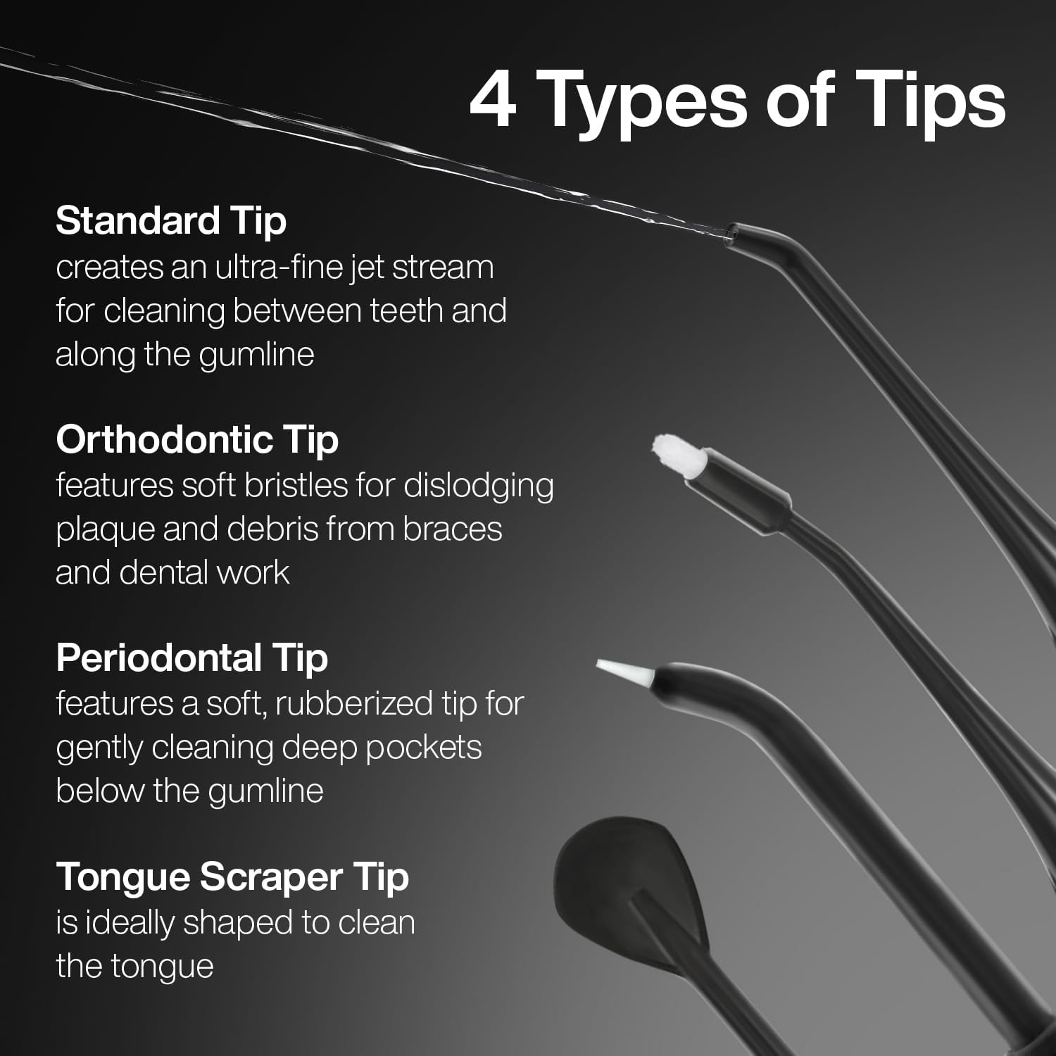 Complete Set of Water Flosser Tips: Includes 5 authentic AquaSonic replacement tips - 2 Standard Tips, 1 Periodontal Tip, 1 Orthodontic Tip & 1 Tongue Scraper for a comprehensive clean,Specialized Cleaning: Each tip is designed to target specific ares of oral hygiene, such as everyday cleaning between teeth and along the gumline, deep pockets, around braces and other dental work, and the tongue,Compatibility: This set is compatible with AquaSonic Icon Rechargeable Water Flosser,Easy Maintenance: Replace tips every 6 months to maintain optimal freshness and oral hygiene,Includes: 2 Standard Tips, 1 Orthodontic Tip & 1 Tongue Scraper