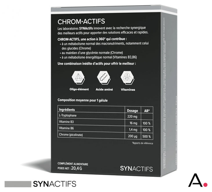Aragan Synactifs Chromactifs 60 Capsules Is A Dietary Supplement With 360° Action That Helps : Normal Metabolism Of Macronutrients, Particularly Carbohydrates, Thanks To Chromium, Maintaining Normal Blood Sugar Levels, Thanks To Chromium, Normal Energy Metabolism, Thanks To Vitamins B3 And B6. Made In France