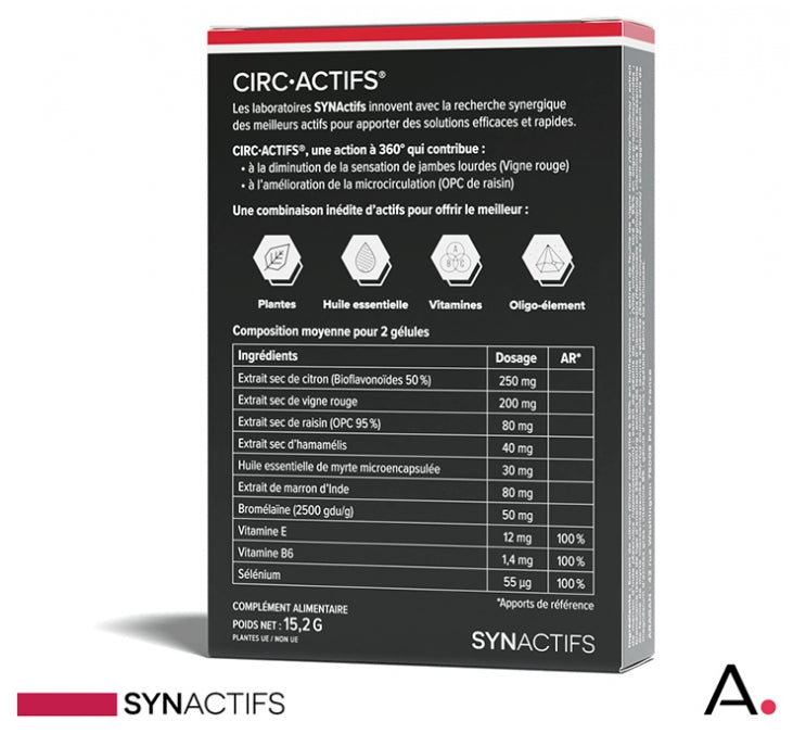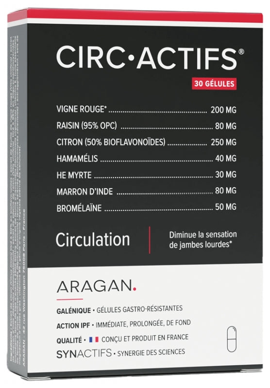 Aragan Synactifs Circactifs 30 Capsules Is A Dietary Supplement With 360° Action That Helps : To Reduce The Sensation Of Heavy Legs (Red Vine), To Improve Microcirculation (Grape Opc). It Contains A Combination Of Active Ingredients: Highly-Concentrated Dry Plant Extracts, Bioflavonoids, Vitamins, Microencapsulated Essential Oils, Trace Elements And A Galenic Formula, Providing : Controlled, Prolonged Release Of Active Ingredients Thanks To Essential Oil Microencapsulation Technology, A Deep Action Thanks To Magnesium, Red Vine And Grape Opc. Made In France