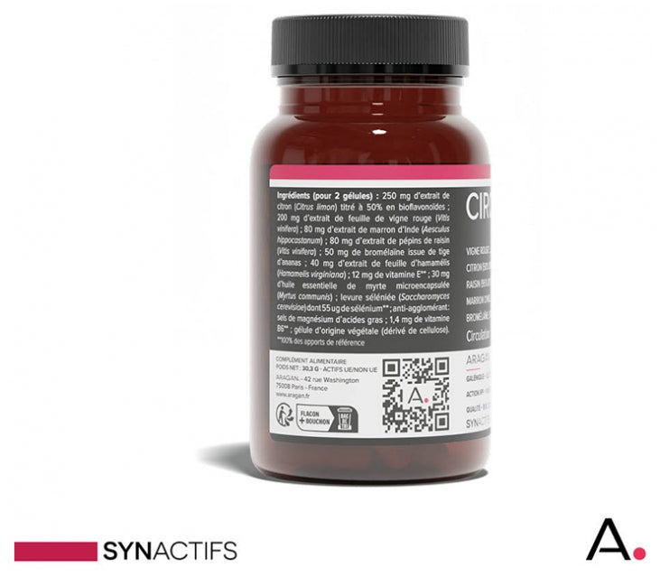 Aragan Synactifs Circactifs 60 Capsules Is A Dietary Supplement With 360° Action That Helps : To Reduce The Sensation Of Heavy Legs (Red Vine), To Improve Microcirculation (Grape Opc). It Contains A Combination Of Active Ingredients: Highly-Concentrated Dry Plant Extracts, Bioflavonoids, Vitamins, Microencapsulated Essential Oils, Trace Elements And A Galenic Formula, Providing : Controlled, Prolonged Release Of Active Ingredients Thanks To Essential Oil Microencapsulation Technology, In-Depth Action Thanks To Magnesium, Red Vine And Grape Opc. Made In France