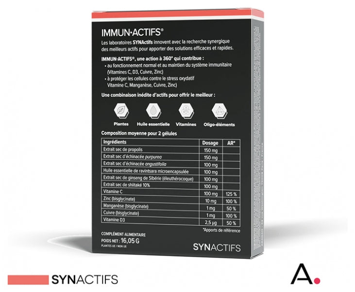 Aragan Synactifs Immunactifs 30 Capsules Is A Dietary Supplement With 360° Action That Helps : Normal Functioning And Maintenance Of The Immune System (Vitamins C, D3, Copper, Zinc), Protect Cells Against Oxidative Stress (Vitamin C, Manganese, Copper, Zinc). It Contains A Combination Of Active Ingredients: Dried Plant Extracts, Trace Elements, Microencapsulated Essential Oils, Vitamins And A Special Galenic Formulation, Providing A Deep Action. Made In France