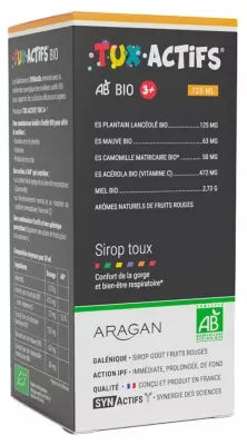 Aragan Synactifs Tuxactifs 3+ Organic 125 Ml Is A Dietary Supplement For Children With 360° Action That Helps : Throat Comfort And Respiratory Well-Being (Chamomile). Normal Functioning And Maintenance Of The Immune System (Vitamin C) It Contains A Combination Of Organic Active Ingredients: Dry Plant Extracts, Vitamins, Beehive Products, And A Galenic Formulation With Vitamin C For In-Depth Action. Red Fruit Flavor. From Age 3. Certified Organic Agriculture. Control Fr-Bio-01. Agriculture Ue/Non-Ue. Made In France