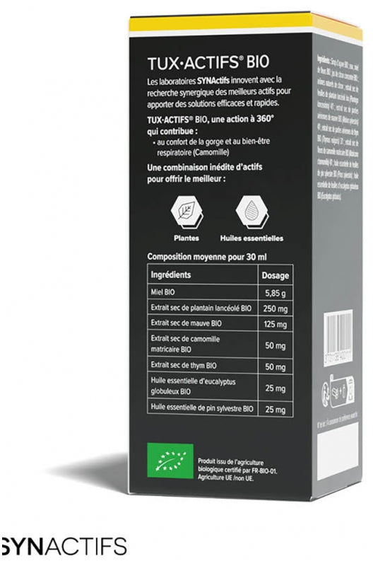 Aragan Synactifs Tuxactifs Organic 125 Ml Is A Dietary Supplement With 360° Action That Contributes To Throat Comfort And Respiratory Well-Being (Chamomile). It Contains A Combination Of Organic Active Ingredients: Dry Plant Extracts, Essential Oils, Beehive Products And A Galenic Formulation Providing A Deep Action Thanks To Essential Oils Of Eucalyptus Globulus And Pine. Certified Organic Agriculture. Control Fr-Bio-01. Agriculture Ue/Non-Ue. Made In France