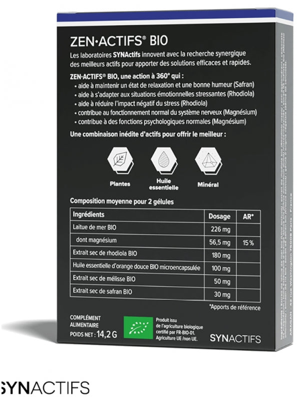 Aragan Synactifs Zenactifs Organic 30 Capsules Is A Dietary Supplement With 360° Action That : Helps Maintain A State Of Relaxation And A Good Mood (Saffron), Helps Adapt To Stressful Emotional Situations (Rhodiola), Helps Reduce The Negative Impact Of Stress (Rhodiola), Contributes To The Normal Functioning Of The Nervous System (Magnesium), Contributes To Normal Psychological Functions (Magnesium). It Contains A Combination Of Active Ingredients: Plants, Microencapsulated Essential Oils, Vitamins And A Special Galenic Formulation, Providing A Deep-Down Action Thanks To Rhodiola And Magnesium. Certified Organic Agriculture. Control Fr-Bio-01. Agriculture Ue/Non-Ue. Made In France