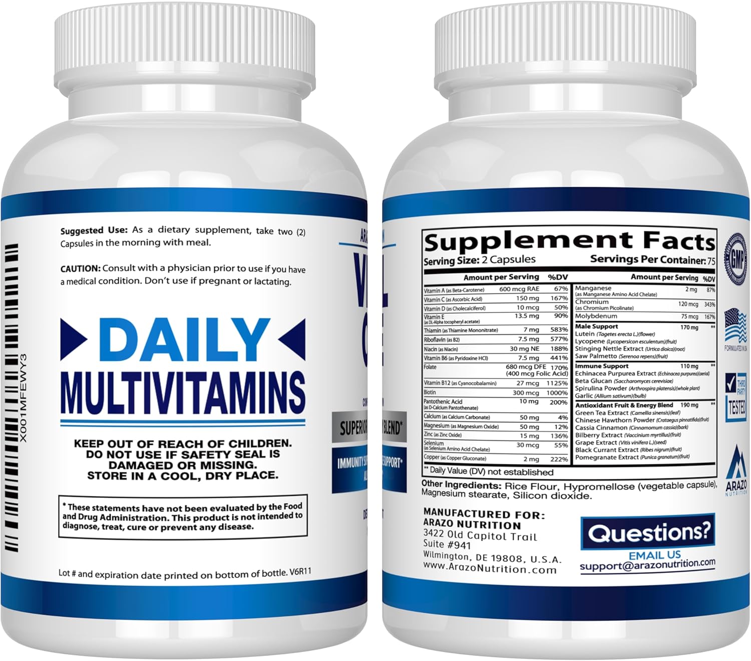 Vital One Multivitamin for Men β Daily Wholefood Supplement - 150 Vegan Capsules β Arazo Nutrition Arazo Nutrition's Vital One Men's Multivitamins β All You Need Daily This Men's Multivitamin is specially designed to meet the everyday nutritional needs of men. Benefits of This Superior Proprietary Blend: Meets Menβs Unique Needs - Urtica Dioica Extract and Saw Palmetto, Lutein and Lycopene. Male Support Blend - Zinc, Selenium, and Vitamins A, C, D and E plus B1, B2, B3, B5, B6, B12, as well as Spirulina, Calcium, Lutein, and Magnesium Energy and Vitality Blend - Green Tea, Hawthorne Berries, Cinnamon Bark Extract, Bilberry Fruit Extract, Grape Seed Extract, Black Currant Fruit Extract and Pomegranate Fruit Extract Immunity Blend β Echinacea, Spirulina, Garlic, Beta Glucan Achieve your optimum health with Arazo Nutrition's Vital One Menβs Multivitamins today! Frequently Bought Together Omega 3 Fish Oil Joint Support Women's Daily Multivitamin Liver Cleanse and Detox Blood Sugar 365 Prostate Support Add to Cart logShoppableMetrics("module-5", true) Add to Cart logShoppableMetrics("module-5", true) Add to Cart logShoppableMetrics("module-5", true) Add to Cart logShoppableMetrics("module-5", true) Add to Cart logShoppableMetrics("module-5", true) Add to Cart logShoppableMetrics("module-5", true) Customer Reviews .aplus-v2 .aplus-review-right-padding { padding-right: 0.1rem; } 4.6 out of 5 stars 29,384 .aplus-v2 .aplus-review-right-padding { padding-right: 0.1rem; } 4.4 out of 5 stars 34,044 .aplus-v2 .aplus-review-right-padding { padding-right: 0.1rem; } 4.3 out of 5 stars 273 .aplus-v2 .aplus-review-right-padding { padding-right: 0.1rem; } 4.3 out of 5 stars 13,528 .aplus-v2 .aplus-review-right-padding { padding-right: 0.1rem; } 4.2 out of 5 stars 9,760 .aplus-v2 .aplus-review-right-padding { padding-right: 0.1rem; } 4.2 out of 5 stars 1,578 Price $25.45 $ 25 . 45 $25.95 $ 25 . 95 $19.95 $ 19 . 95 $20.95 $ 20 . 95 $18.95 $ 18 . 95 $19.95 $ 19 . 95 Why Should I Take This Supports Brain, Joints, Hair and Mood* Supports Joints for Relief* Supports Overall Wellbeing for Women* Supports Liver and Body* Supports Healthy Sugar Levels* Supports Prostate* Key Health Benefits* Triple Strength Formula*/ High EPA and DHA Levels*/ Burpless*/ No Fishy Aftertaste*/ Highly Refined and Pure* Powerful Joint Mobility Formula*/ Extra Strength Ingredients - Glucosamine 1500mg, Chondroitin 1200mg, Msm 1000mg with Turmeric, Boswellia, Hyaluronic Acid*/ Boost Joint Mobility*/ Ease Stiff Joints* Superfoods Multivitamin*/ Over 37+ Ingredients for Women's Vitality*/ Supports Mental Alertness, Mood and Immunity*/ Ultra Potent - Once Daily Formula* Revitalize Overworked Livers*/ Supports Weight*/ Gut Friendly Formula*/ Supports Energy and Vitality*/ Easy and Convenient to Use* Supports Healthy Sugar and Carb Absorption* / Supports Heart Health*/ Supports Immunity* Supports Urinary Flow*/ Supports Prostate Function*/ Supports Hair Growth and Slows Hair Loss with DHT Blocker*/ Supports Stamina* *These statements have not been evaluated by the Food and Drug Administration. This product is not intended to diagnose, treat, cure, or prevent any disease,Arazo Nutrition - Men's Multivitamin VITAL ONE,Made in USA,Wholefoods and superfoods sourced; 15+ dark green, yellow, orange, purple, blue & red raw fruits, vegetables, berries, greens & seeds for enhanced bioavailability,Support prostate, vision & heart; 4 herbs for male vitality: Saw Palmetto, Stinging Nettle & more,High potency; 35+ active vegetarian ingredients, many at 100% value or higher, 600mcg RAE of Vitamin A, multiple minerals, antioxidants, botanicals: Spirulina, Garlic, Echinacea & more,Reliable; made in a GMP certified facility in America and third party safety tested for purity,High standard; trusted for ingredient safety, nutritional value and label accuracy