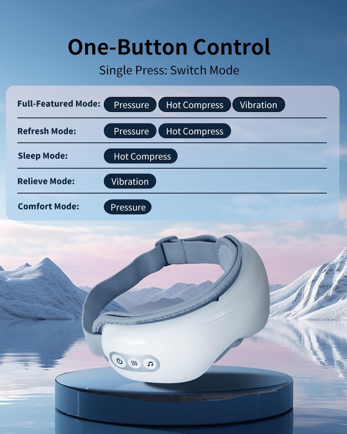 Easy Operation At Your FingertipsWith three intuitive buttons to control massage mode, temperature, and volume, This eye mask massager with heat is designed for effortless use. Enjoy a seamless experience and focus on unwinding, knowing that ultimate comfort is just a button press away