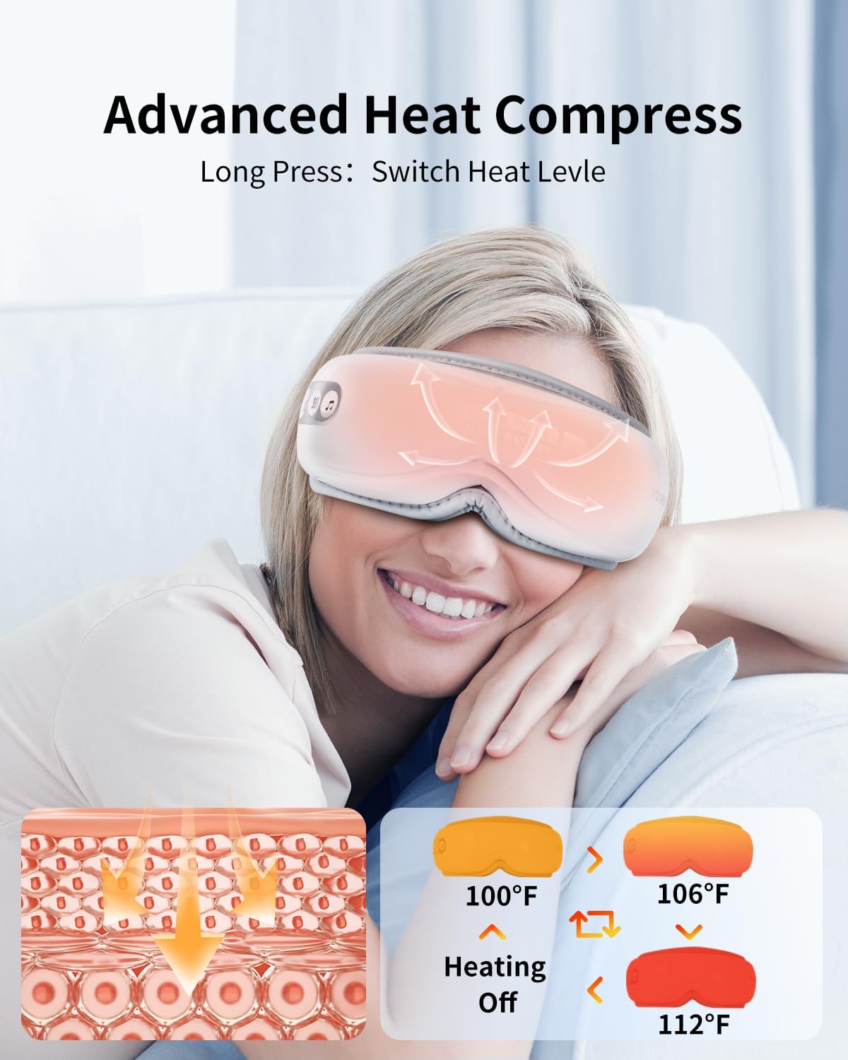 Ultimate Eye Relief With Custom HeatExperience blissful relaxation with Arboleaf eye massager, featuring three levels of hot compress (104°F, 107.6°F, 113°F) to soothe your eyes completely. Perfect for alleviating eye strain, soothing tired eyes, and addressing dark circles, this heated eye massager brings spa-quality comfort to your home