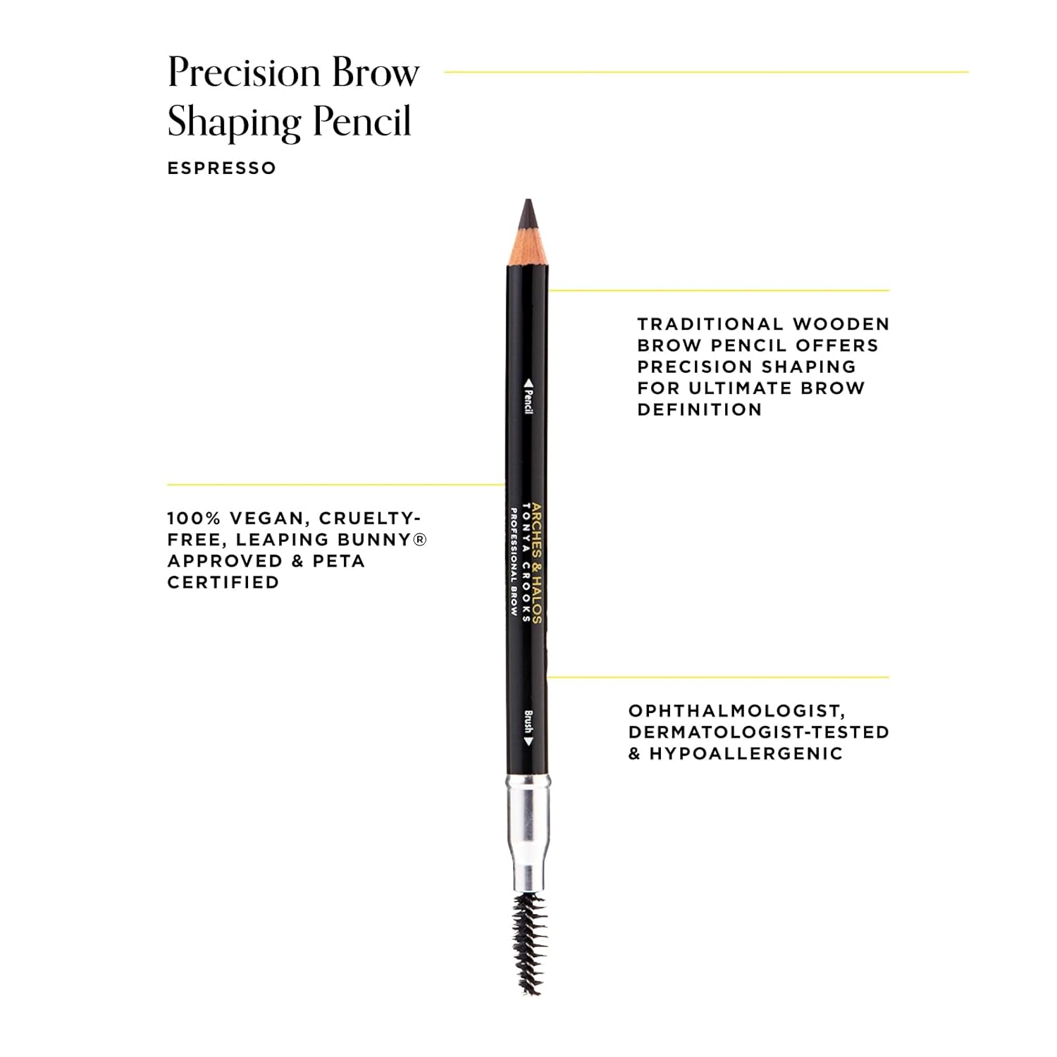 Finally, experience a one-stop shop for any and every one of your eyebrow styling needs, all with top-quality design and unbeatable prices. From the heart of Beverly Hills comes Arches & Halos, founded by Tonya Crooks, master eyebrow stylist to the stars. For over 20 years Tonyaās Beverly Hills CA Brow Styling Salon has been the go to place to get your brows the professional make over. A brow magician Tonyaās clients call her THE Brow Gal. Tonyaās artistry and skill is now translated to Arches & Halos so anyone at home can make their brows naturally their best beauty asset. With the Arches & Halos collection of Brow Grooming, Brow Shaping, Brow Filling and Brow Defining tools you can be assured the product the highest professional quality. Just follow Tonyaās 6 simple steps to the perfect brow. Watch the brow magic happen before your eyes. Embodied Brows. Embodied Beauty. Be Bold. Be You. Be Light,YOUR BEST BROWS EVER. The Precision Brow Shaping Pencil is a dual ended brow definer tool that makes shaping, filling, and shading fast and simple. Add volume and dimension to thin, fine brows, or layer and build for a bold, pigmented finish,SMOOTH, NATURAL-LOOKING STYLE. Our creamy, glide-on formula is ultra buildable, helping you find your perfect shape and shade. Flick the pointed tip to create hair like strokes, or pack the brush with product for some extra length and volume,YOUR ALL-IN-ONE BROW STYLER. Our spoolie brush is soft but strong- the perfect blending tool that effortlessly fills and smooths in product, without feeling harsh on skin. Shape and style with perfection, for a look that stays in place all day,DESIGNED WITH YOU IN MIND. All of the highly curated brow and styling products at Arches & Halos are of professional grade quality, and ophthalmologist and dermatologist-tested and approved for the ensured safety of your eyes and skin,ALL YOUR EYEBROW ESSENTIALS. Finally, a one-stop shop for top quality brow styling products. From the heart of Beverly Hills comes Arches & Halos by Tonya Crooks, eyebrow stylist to the stars, helping you make your brows your best beauty asset