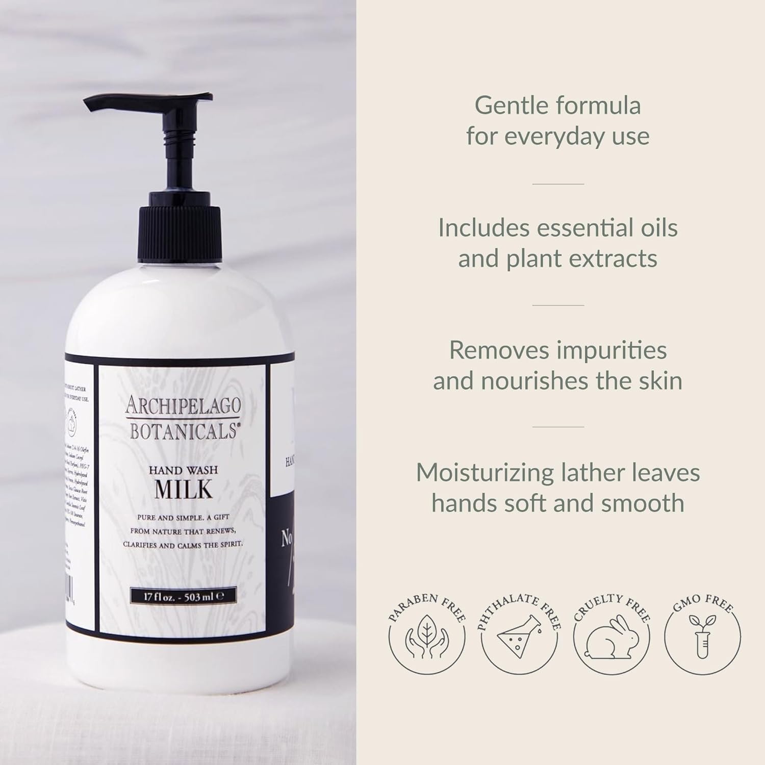 About this item Milk Hand Wash: Blended with dried milk solids and natural soy, oat, and rice proteins to nourish and sooth with key notes of soy, wild oats, and vetiver. Moisturizing Hand Soap: Its moisturizing properties prevent dryness, leaving hands feeling soft and nourished even with frequent use, ideal for maintaining skin health. Bathroom Essentials: This light foaming hand soap effectively removes dirt and oils, ensuring thorough cleansing and hygiene protection for all types of skin; apply liberally, work into a lather, and rinse. Plant-Based Hand Soap: Free from parabens, sulfates, phthalates, and harmful chemicals, leaving skin hydrated and nourished. The Art of Living Well: At Archipelago Botanicals, we believe that the art of living well is about choosing simple products, with simple ingredients, to help manage the simple moments in our lives. See more product details,Milk Hand Wash: Blended with dried milk solids and natural soy, oat, and rice proteins to nourish and sooth with key notes of soy, wild oats, and vetiver,Moisturizing Hand Soap: Its moisturizing properties prevent dryness, leaving hands feeling soft and nourished even with frequent use, ideal for maintaining skin health,Bathroom Essentials: This light foaming hand soap effectively removes dirt and oils, ensuring thorough cleansing and hygiene protection for all types of skin; apply liberally, work into a lather, and rinse,Plant-Based Hand Soap: Free from parabens, sulfates, phthalates, and harmful chemicals, leaving skin hydrated and nourished,The Art of Living Well: At Archipelago Botanicals, we believe that the art of living well is about choosing simple products, with simple ingredients, to help manage the simple moments in our lives