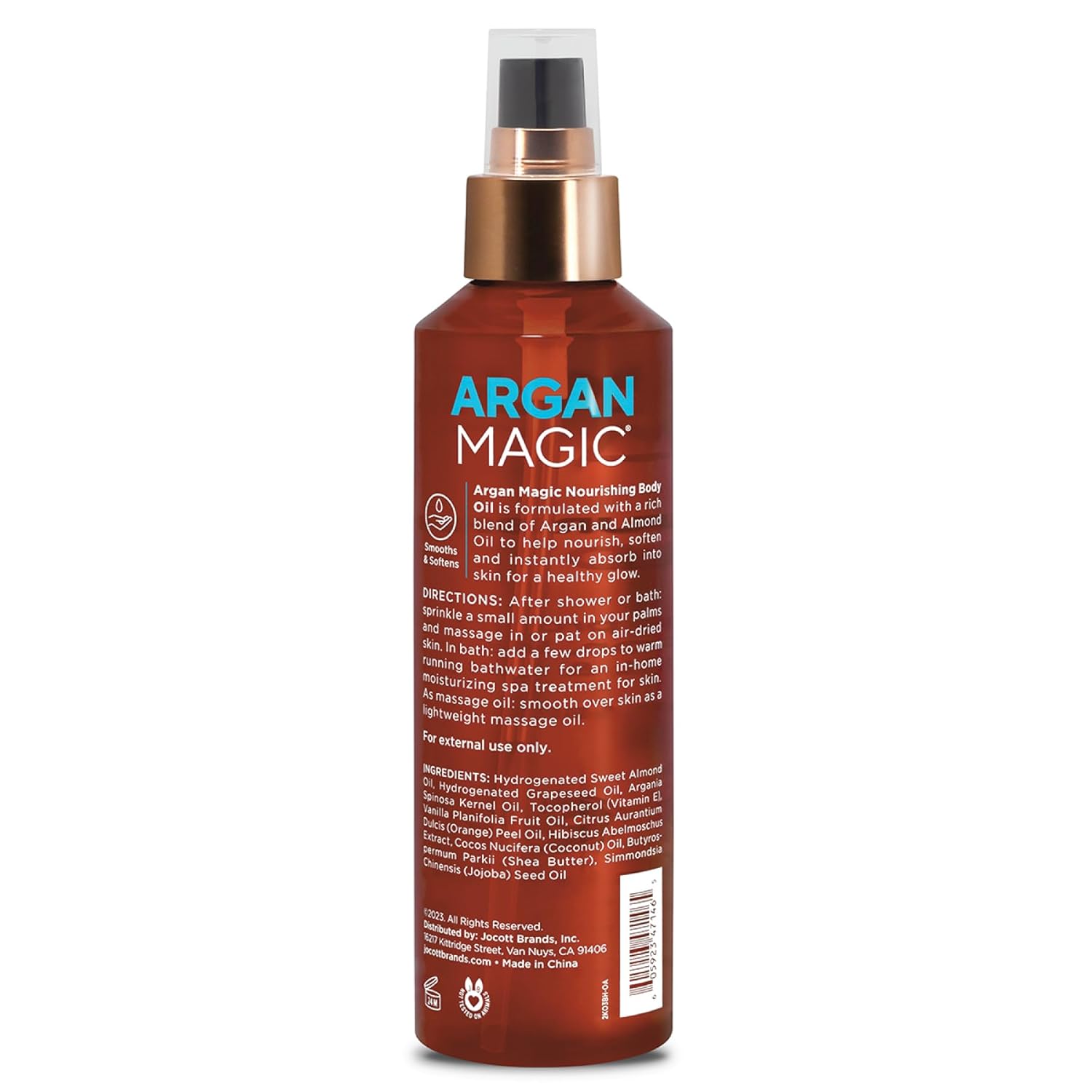 About this item ARGAN MAGIC NOURUSHING BODY OIL (6 FL Oz): This Nourishing Body Oil provides intense hydration, leaving your skin soft, radiant, and glowing. ARGAN & ALMOND OIL BLEND: Formulated with a rich blend of Argan Oil and Almond Oil, this body oil nourishes and softens your skin. INSTANT ABSORPTION: The lightweight formula instantly absorbs into your skin, providing moisture without a greasy feel. SOFTENS AND RADIATES: The nourishing properties of Argan and Almond Oil work together to soften and enhance the radiance of your skin. THE MOROCCAN BEAUTY SECRET: Argan Magic Products are inspired by the Ancient Beauty Rituals Of Morocco. Moroccan people use only the most potent natural ingredients to keep their entire body beautified, and their beauty traditions have been passed down from generation to generation. Argan Magic incorporated these traditions and generations-old recipes in all its products to create unique and powerful blends that will simply amaze you. MADE IN USA, CRUELTY FREE, PARABEN FREE. See more product details,ARGAN MAGIC NOURUSHING BODY OIL (6 FL Oz): This Nourishing Body Oil provides intense hydration, leaving your skin soft, radiant, and glowing,ARGAN & ALMOND OIL BLEND: Formulated with a rich blend of Argan Oil and Almond Oil, this body oil nourishes and softens your skin,INSTANT ABSORPTION: The lightweight formula instantly absorbs into your skin, providing moisture without a greasy feel,SOFTENS AND RADIATES: The nourishing properties of Argan and Almond Oil work together to soften and enhance the radiance of your skin,THE MOROCCAN BEAUTY SECRET: Argan Magic Products are inspired by the Ancient Beauty Rituals Of Morocco. Moroccan people use only the most potent natural ingredients to keep their entire body beautified, and their beauty traditions have been passed down from generation to generation. Argan Magic incorporated these traditions and generations-old recipes in all its products to create unique and powerful blends that will simply amaze you,MADE IN USA, CRUELTY FREE, PARABEN FREE